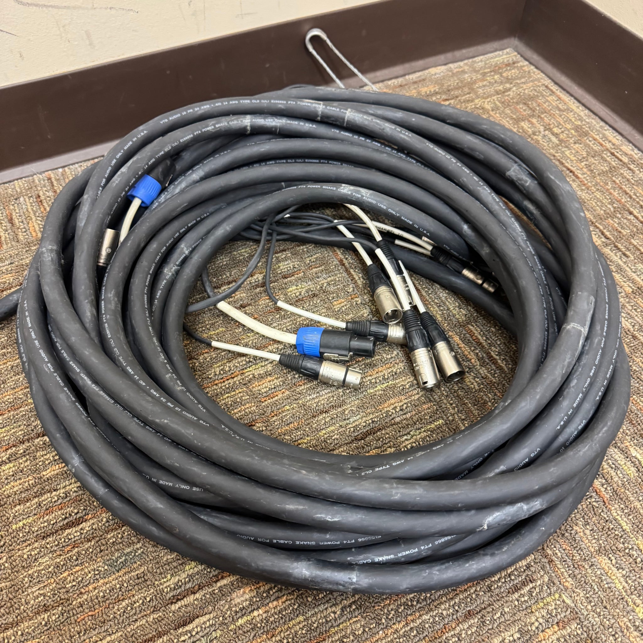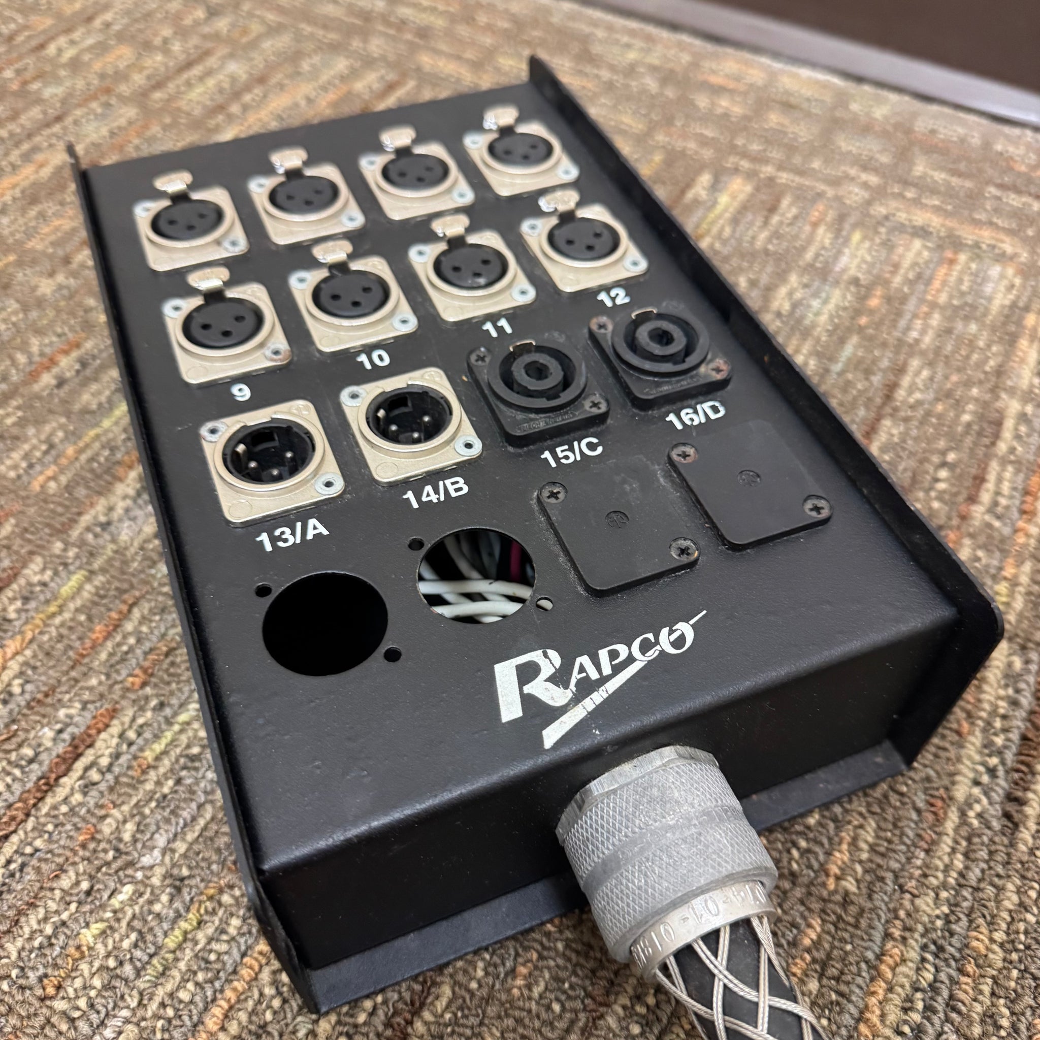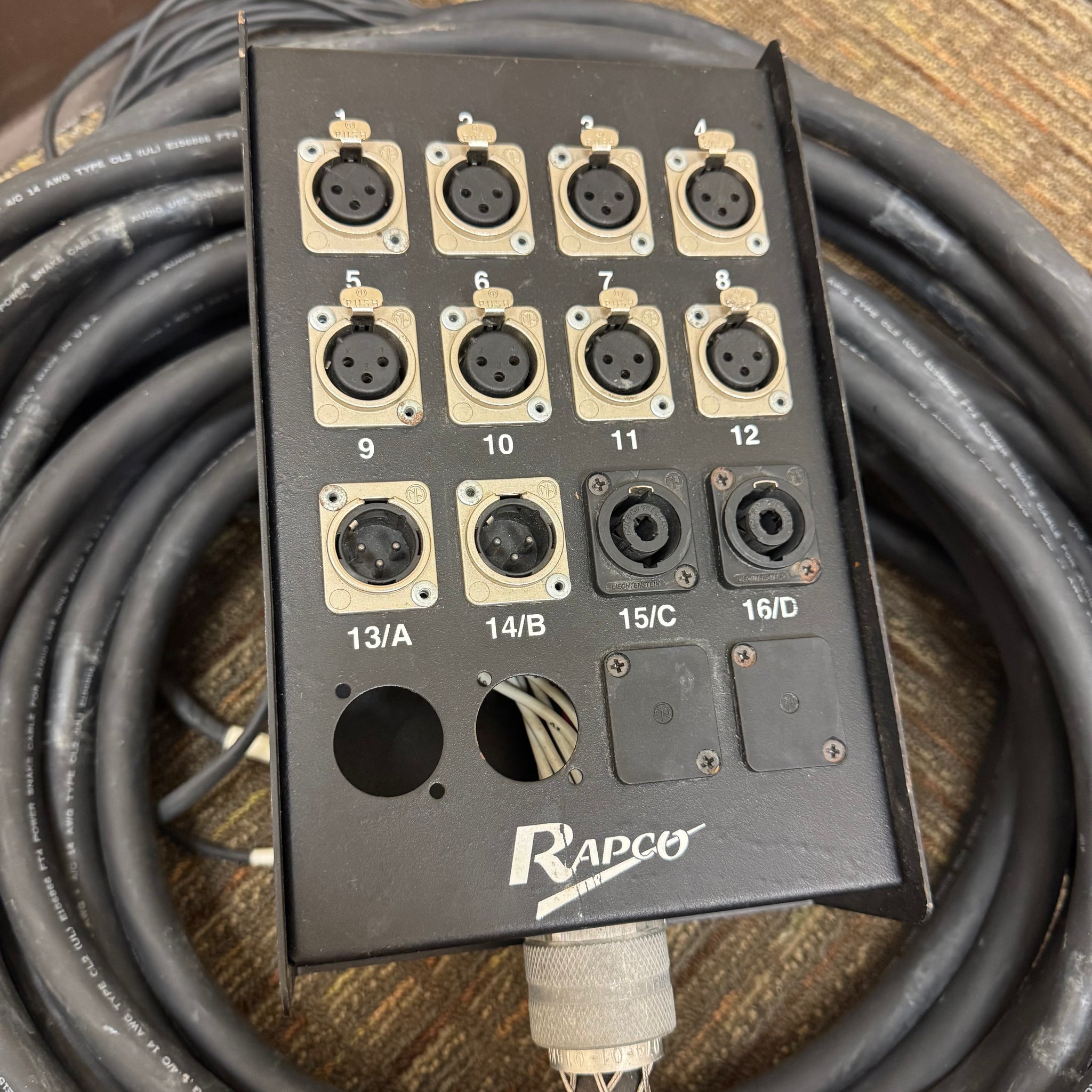 The Rapco 75’ Snake USA 8 x4 is a high-quality audio snake cable designed for professional use. Measuring 75 feet in length, it features eight input channels and four output channels (2 speakon and 2 XLR), making it ideal for complex stage and studio setups. Built in the USA, this cable ensures durability and reliable signal transmission, essential for maintaining pristine audio clarity. Its very good condition reflects careful use and robust construction, promising a dependable connection for your sound equipment. Whether for live performances or recording sessions, this snake cable offers versatility and superior performance to meet demanding audio needs.