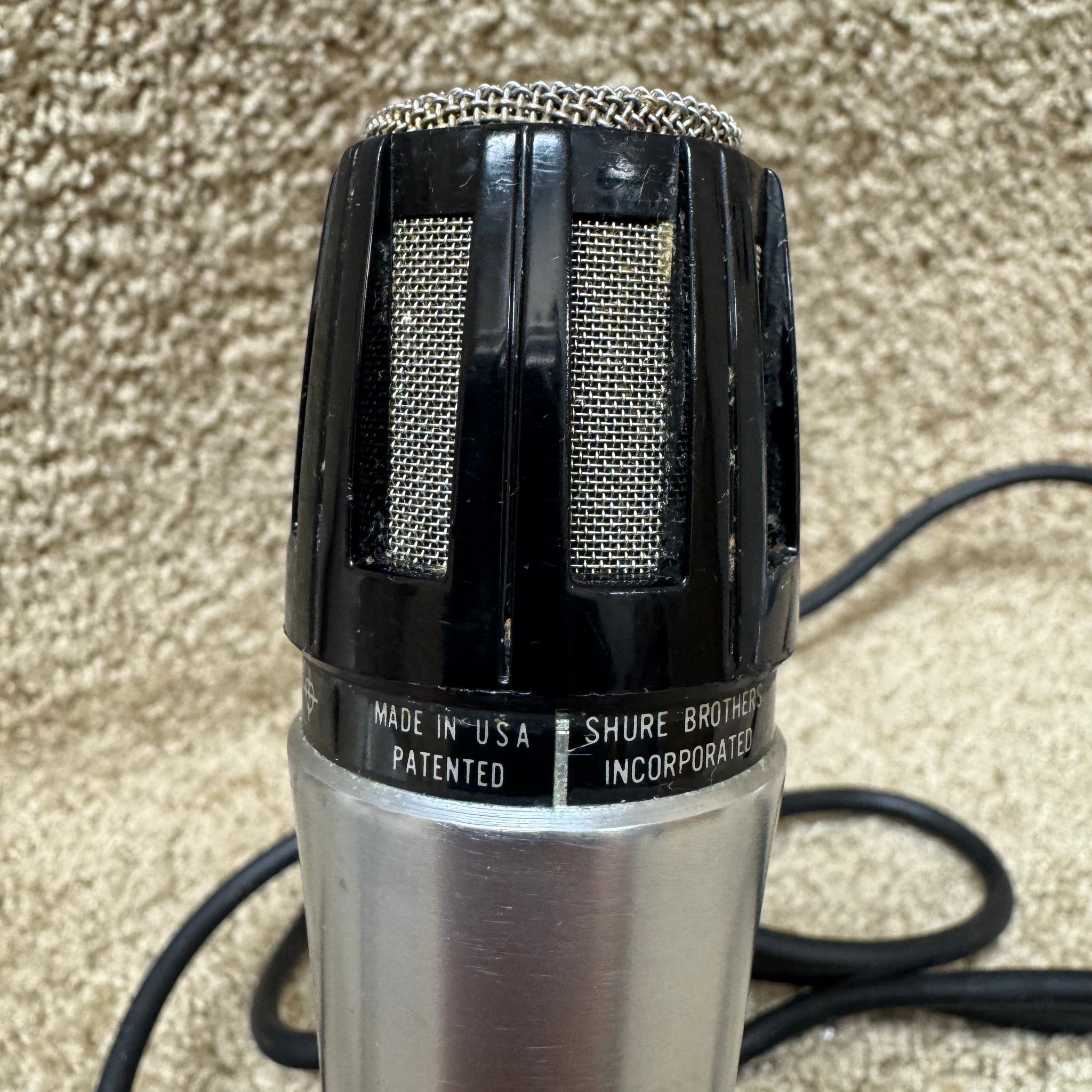 Shure Model 515 Series UNIDYNE B Microphones are cardioid (unidirectional) dynamic units that provide excellent reproduction of voice and music. Their unidirectional pickup pattern greatly reduces feedback problems, permitting operation closer than usual to loudspeakers without the annoying squeal or howl caused by feedback. Suppression of feedback, combined with their smooth sound, makes the UNIDYNE B Microphones ideal for use by small groups, instrumentalists, and vocalists in theaters, night clubs, schools, and churches. The microphones are equipped with an On-Off switch with a lockplate for locking the switch On. A slip-in swivel adapter is supplied for convenience of either handheld or stand mounted use. The cable is hardwired to this mic leading up to a 1/4" TS output, there are some some signs of use like some discolored spots around the grille and light kinks in the cable but overall the mic is in good shape for its age.