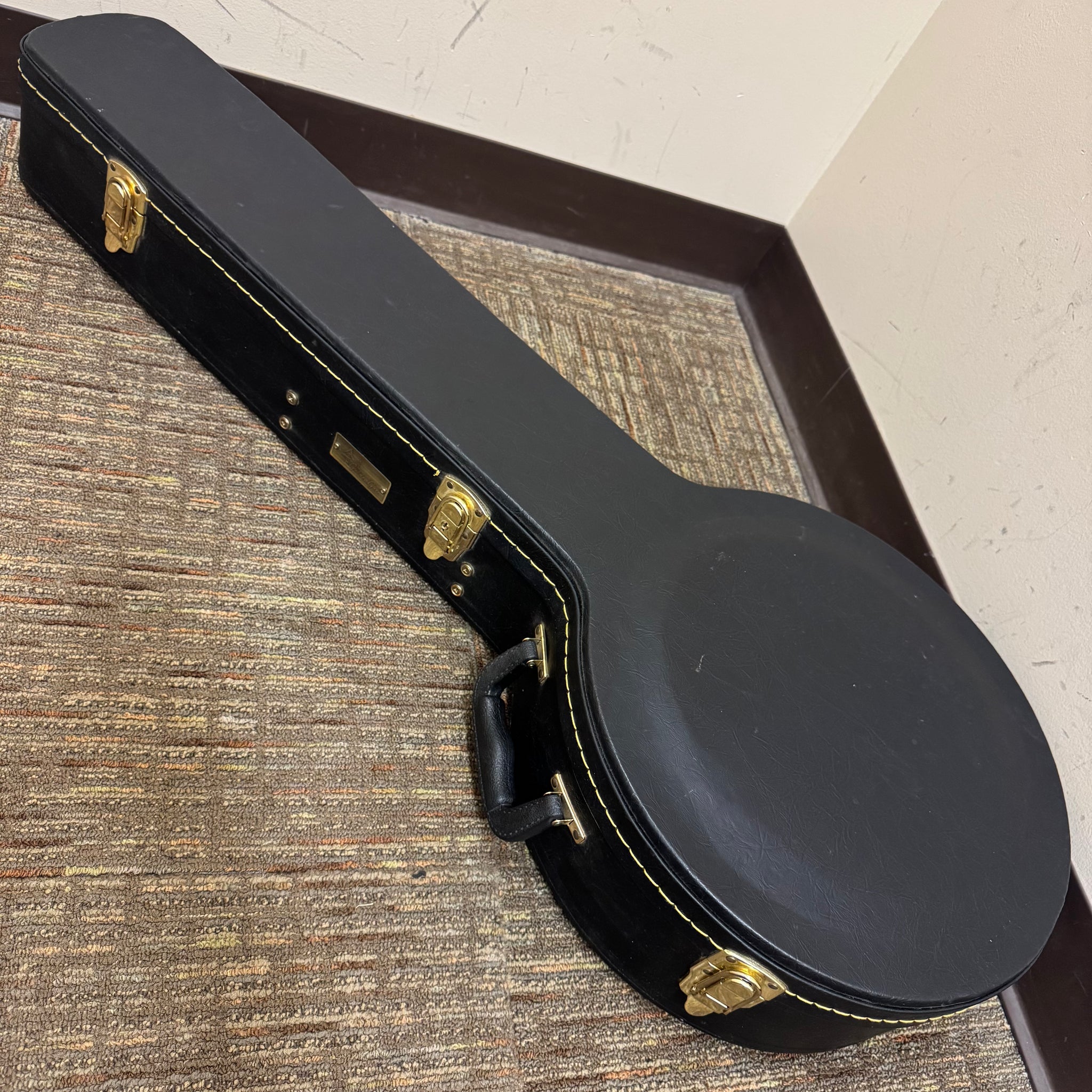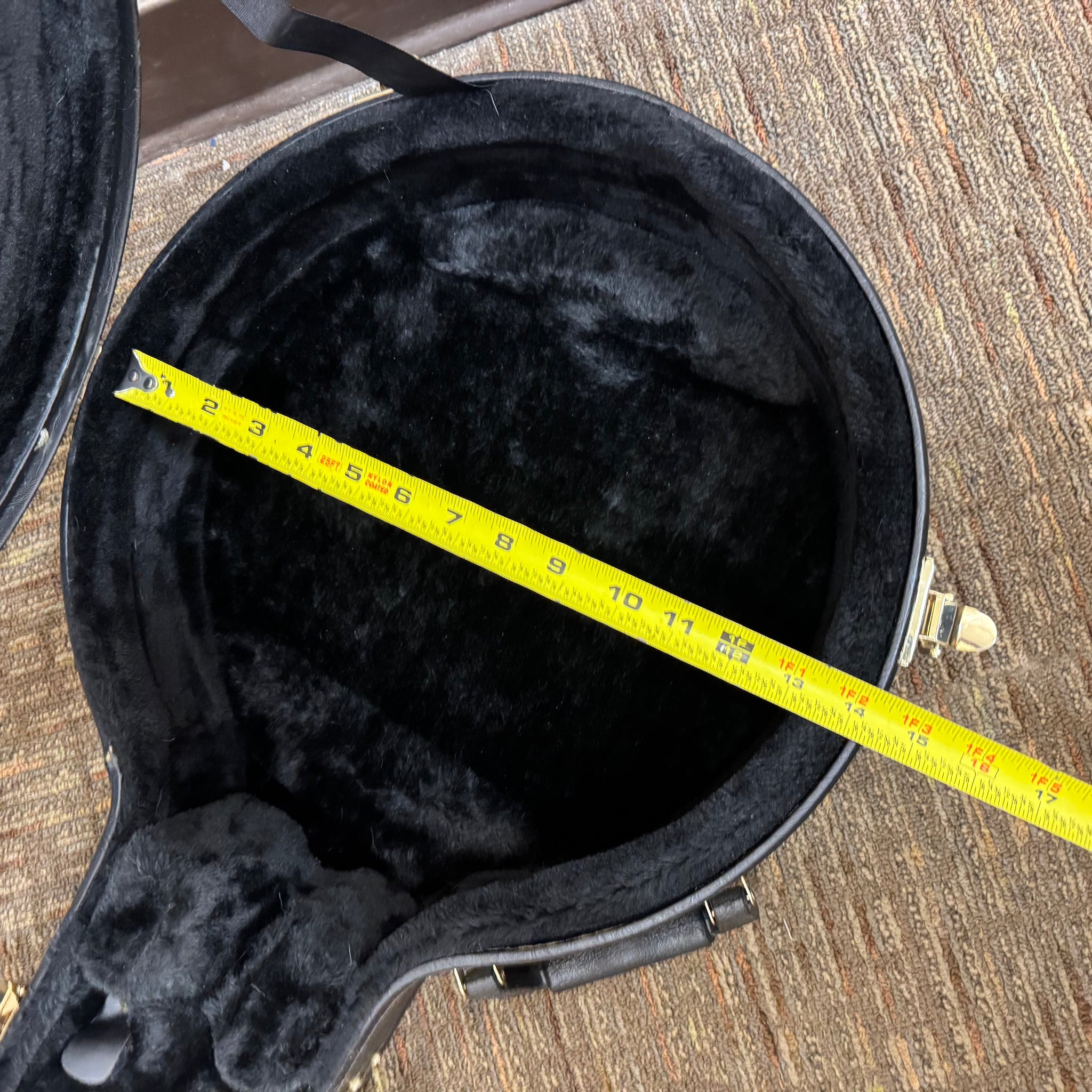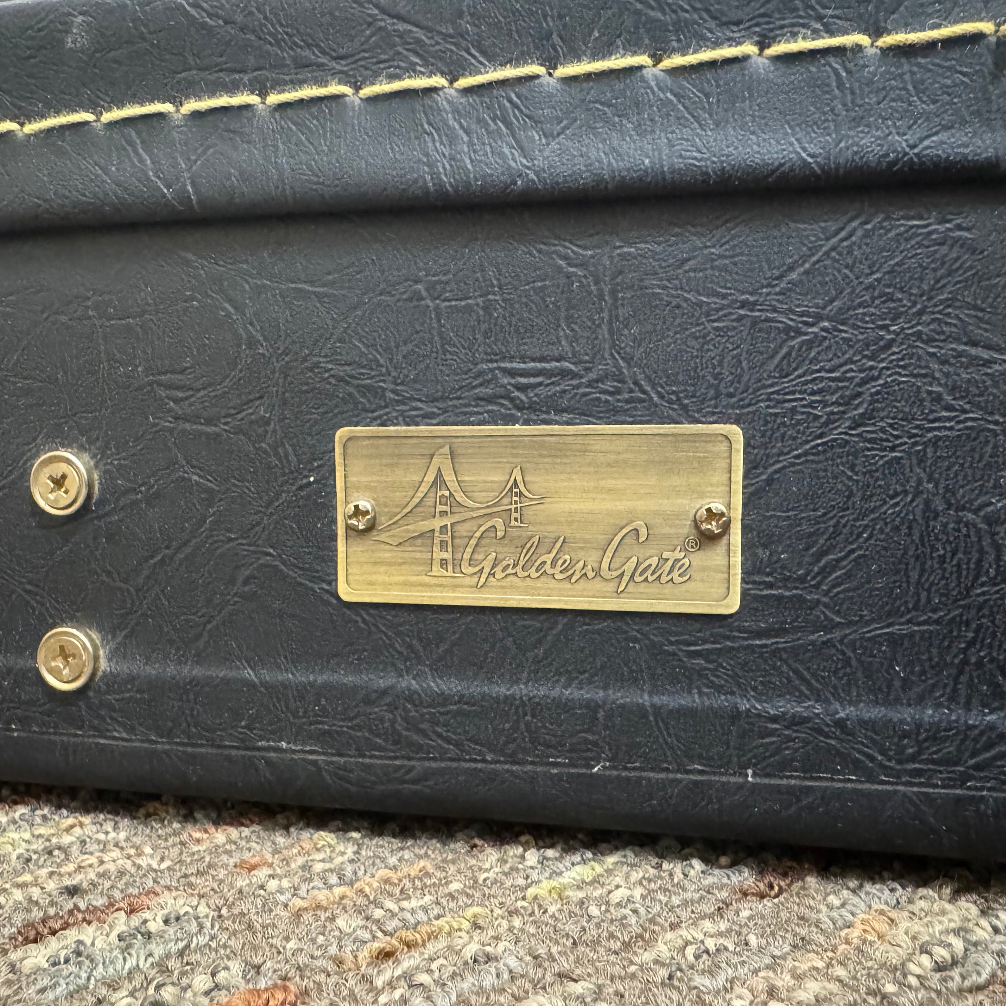 This is a Golden Gate hardshell case for resonator banjos. It features one compartment for accessories, and a gorgeous padded plush interior. Includes a key for the lock. There are a few scratches and scuffs on the exterior but overall it is in very good shape. Excellent for most resonator banjos! The dimensions are listed in the pictures included and below.