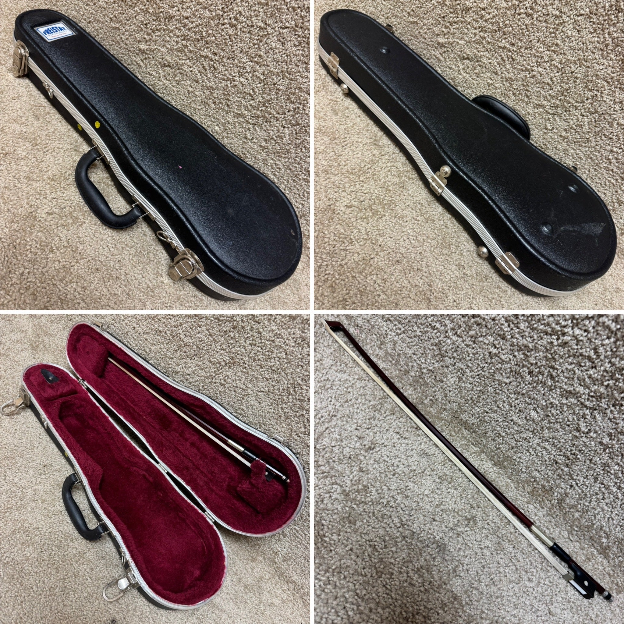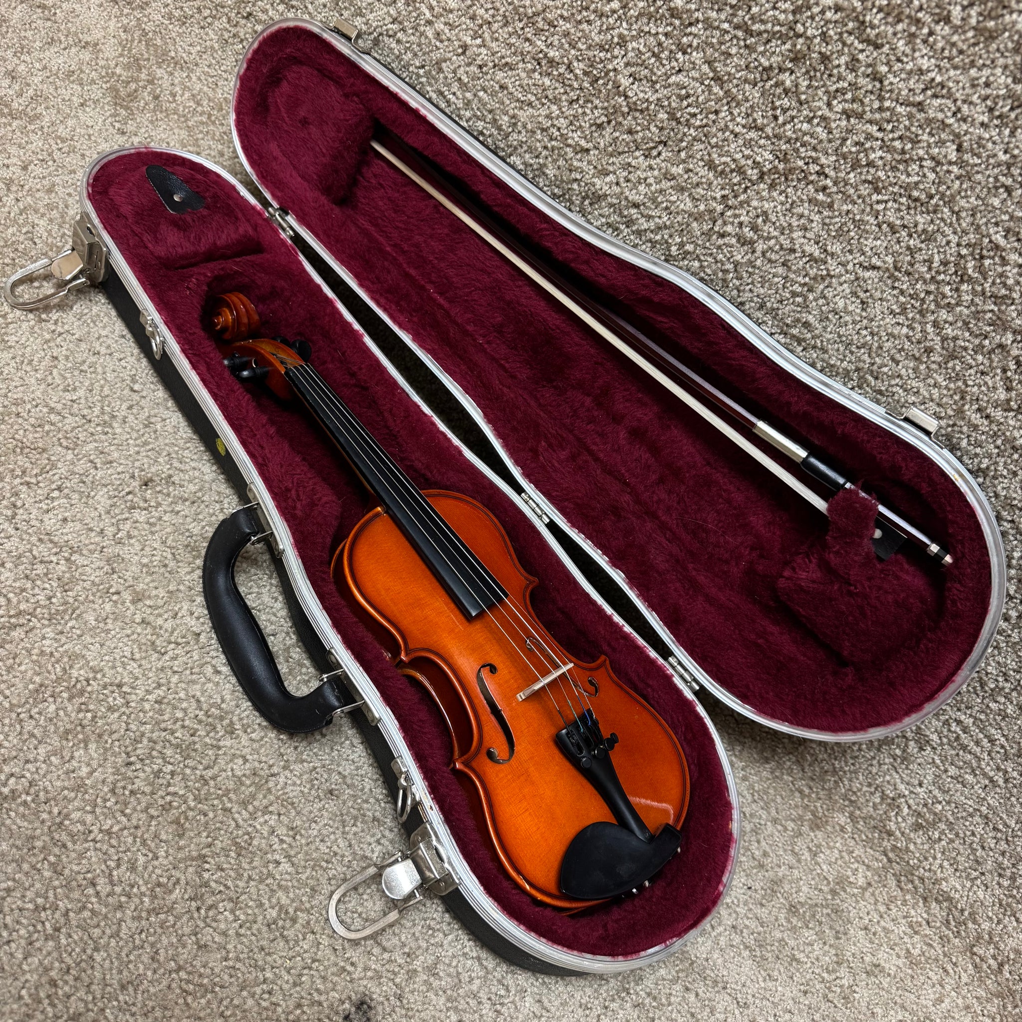 This unlabeled 1/8th fractional size violin is a great choice for a younger beginner. This instrument comes with a case and a bow. There are some light dings and scratches in some places on the body , but overall it is in very good condition and plays well.