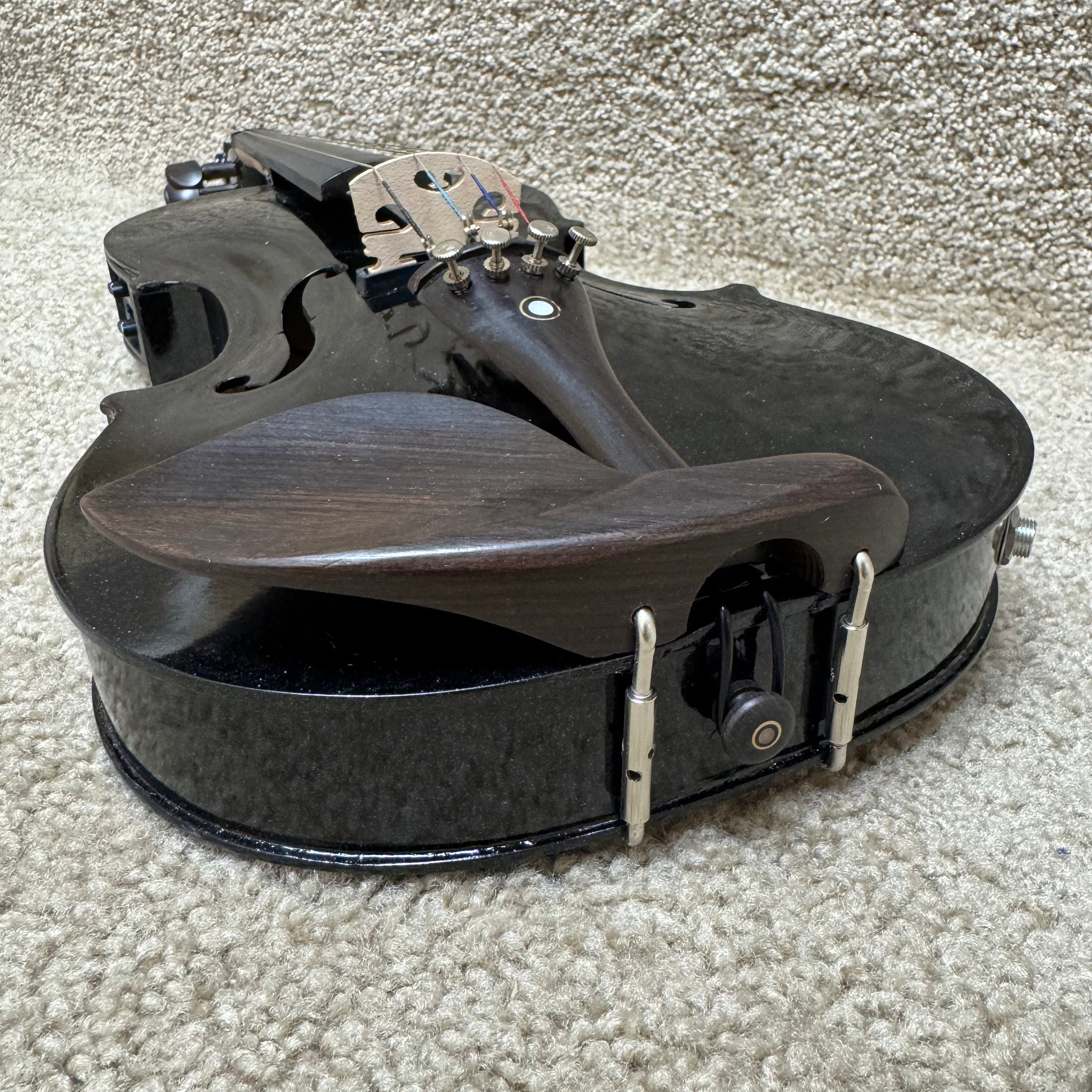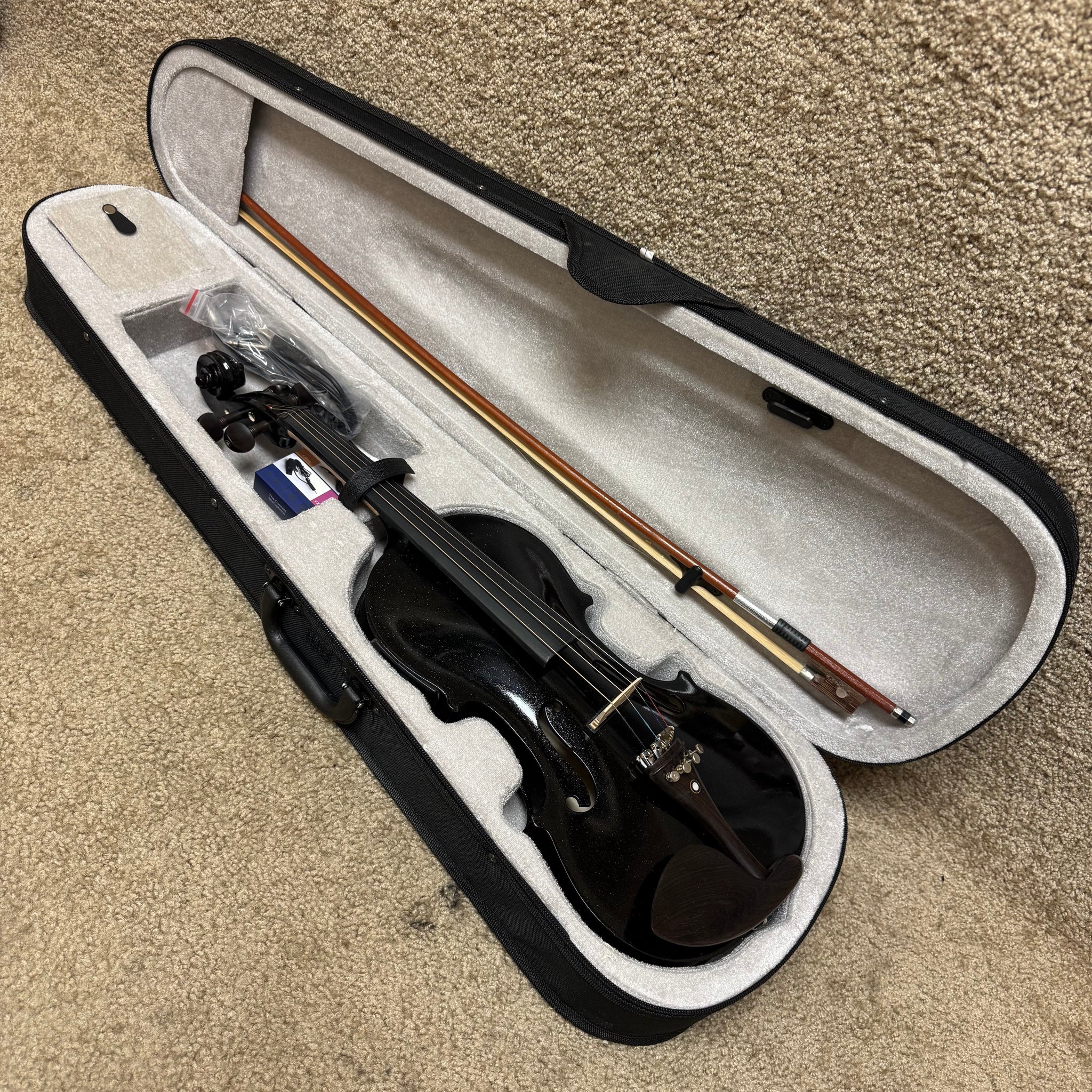 This stunning black sparkle electric violin in 4/4 size is in excellent condition with barely noticeable wear. Designed for serious players seeking authentic sound with modern amplification, it features a professional 1/4" output jack for seamless connection to any amp or audio system. The complete package includes everything needed to start playing immediately: a protective carrying bag for safe transport, a quality bow, a standard audio cable, and rosin for optimal bow maintenance. Whether you're a dedicated musician upgrading your rig or exploring the electric violin sound, this unlabeled instrument delivers exceptional performance and reliability at an unbeatable value.