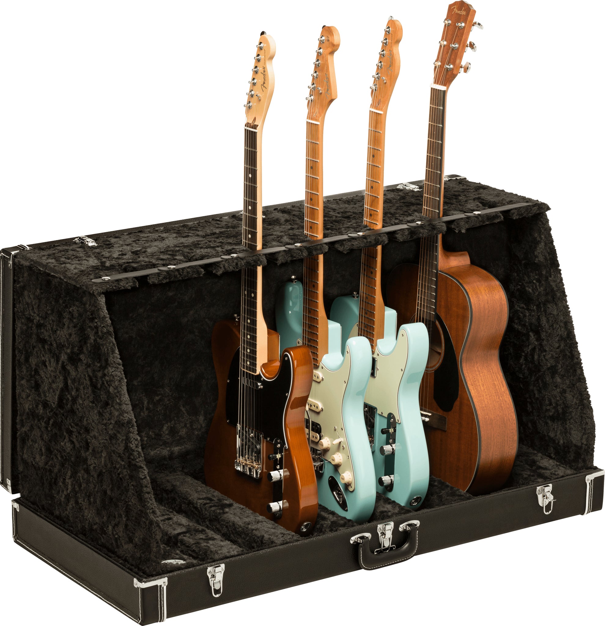 Fender Instrument Case Stands are a great way to display and protect multiple instruments. This case stand looks like a traditional case but easily turns into a stage-worthy guitar stand. Crafted with road-reliable materials, this 3-ply hardshell wooden case boasts a vinyl-wrapped steel carry handle and steel latches. The soft, crushed-acrylic plush interior lining ensures your guitars remain scratch and damage-free.