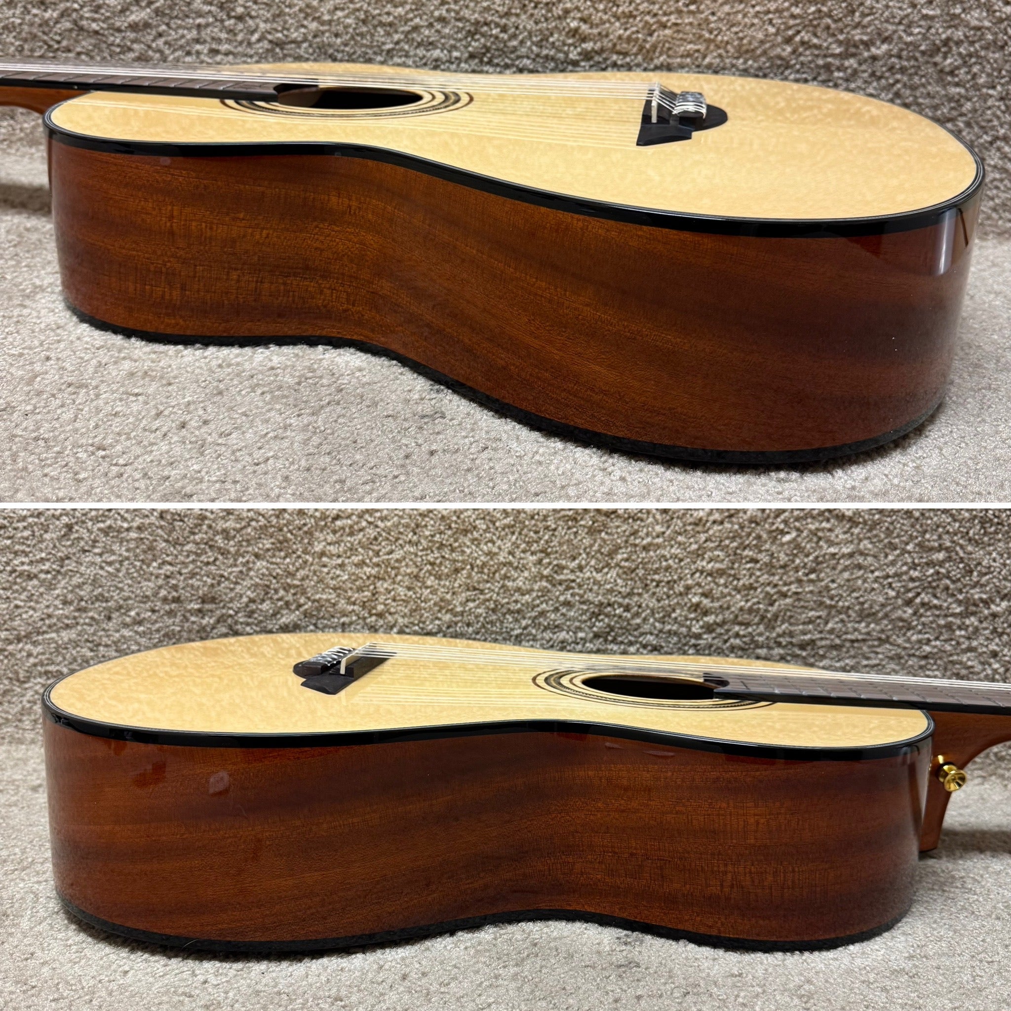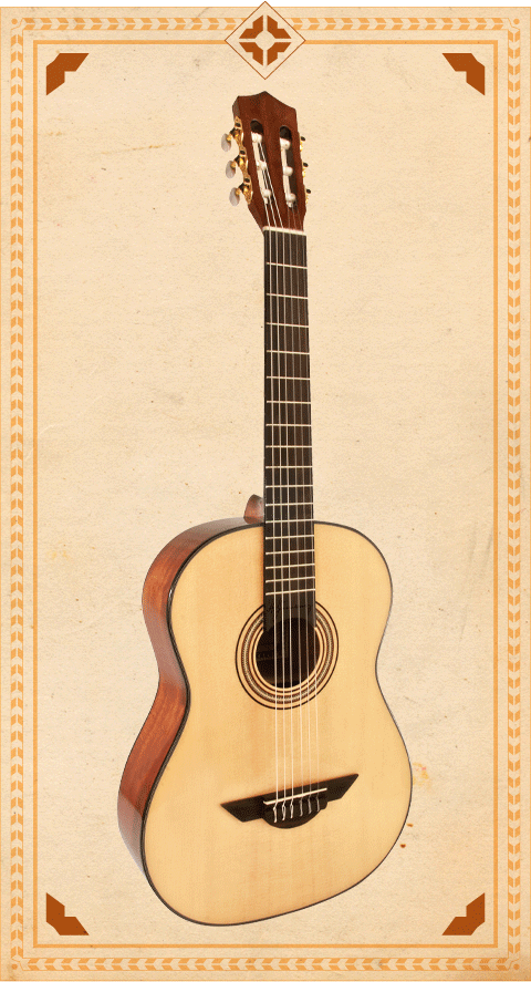 LG2 – El Artista (The Artist) – H. Jimenez nylon string guitar with a laminated spruce top and mahogany back and sides, decorated with multi-ply binding. The comfortable neck profile neck is topped off with smooth action gold tuners with white pearloid buttons. Also it is equipped with the special H. Jimenez design Thunderwing™ bridge for optimum performance.