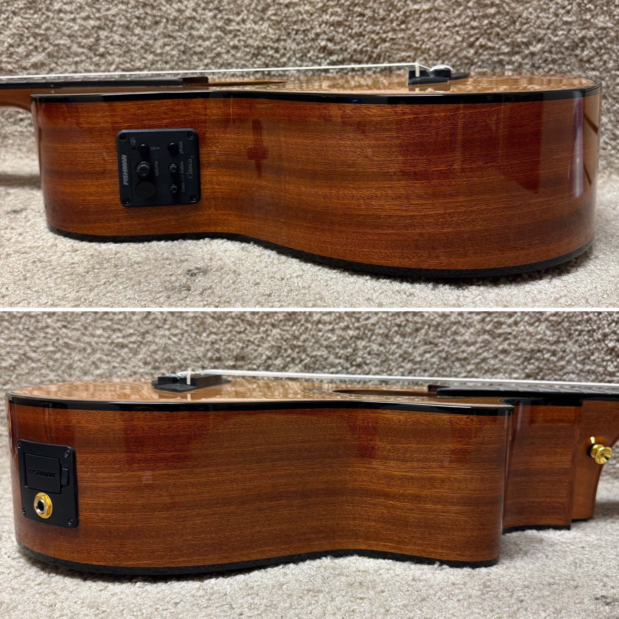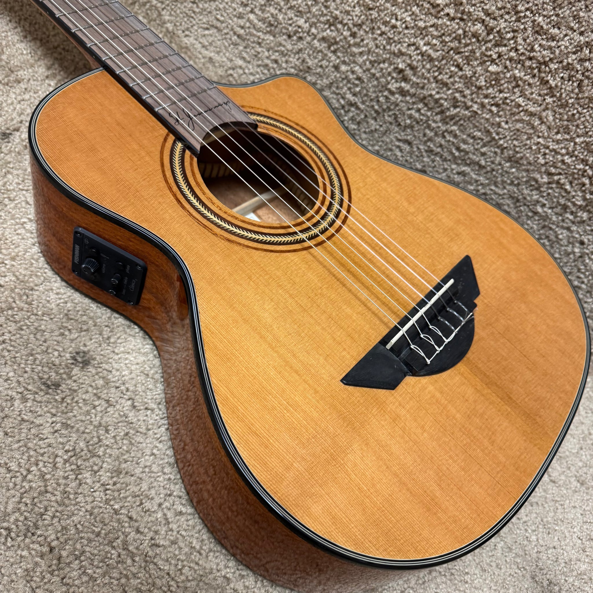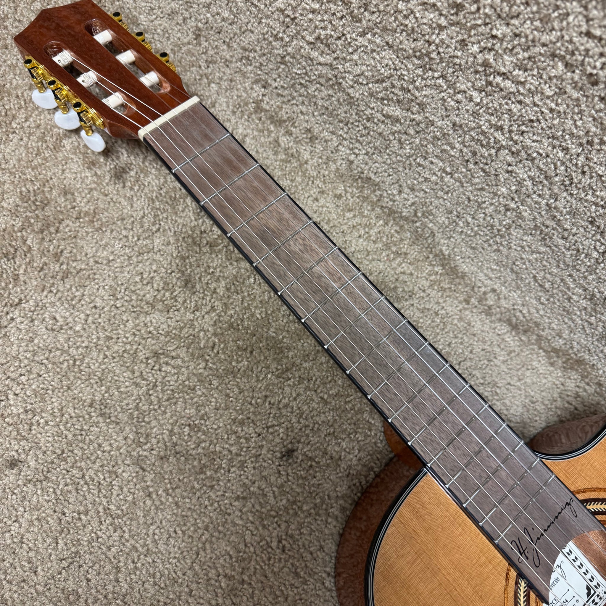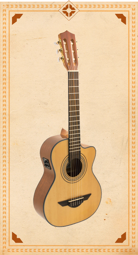 This inspiring cutaway requinto has a solid cedar top, mahogany back and sides, multi-ply binding on the body. It is topped off with an H. Jimenez headstock with ultra-smooth action gold tuners with deluxe gold-tipped white pearloid buttons. The venetian cutaway allows for easy access to the higher frets, and is equipped with the special H. Jimenez design Thunderwing™ bridge for optimum performance. Includes Fishman CLA-101 pickup system with bass, treble, phase and on-board tuner. Each H. Jimenez instrument includes a limited lifetime warranty and a black padded gig bag.