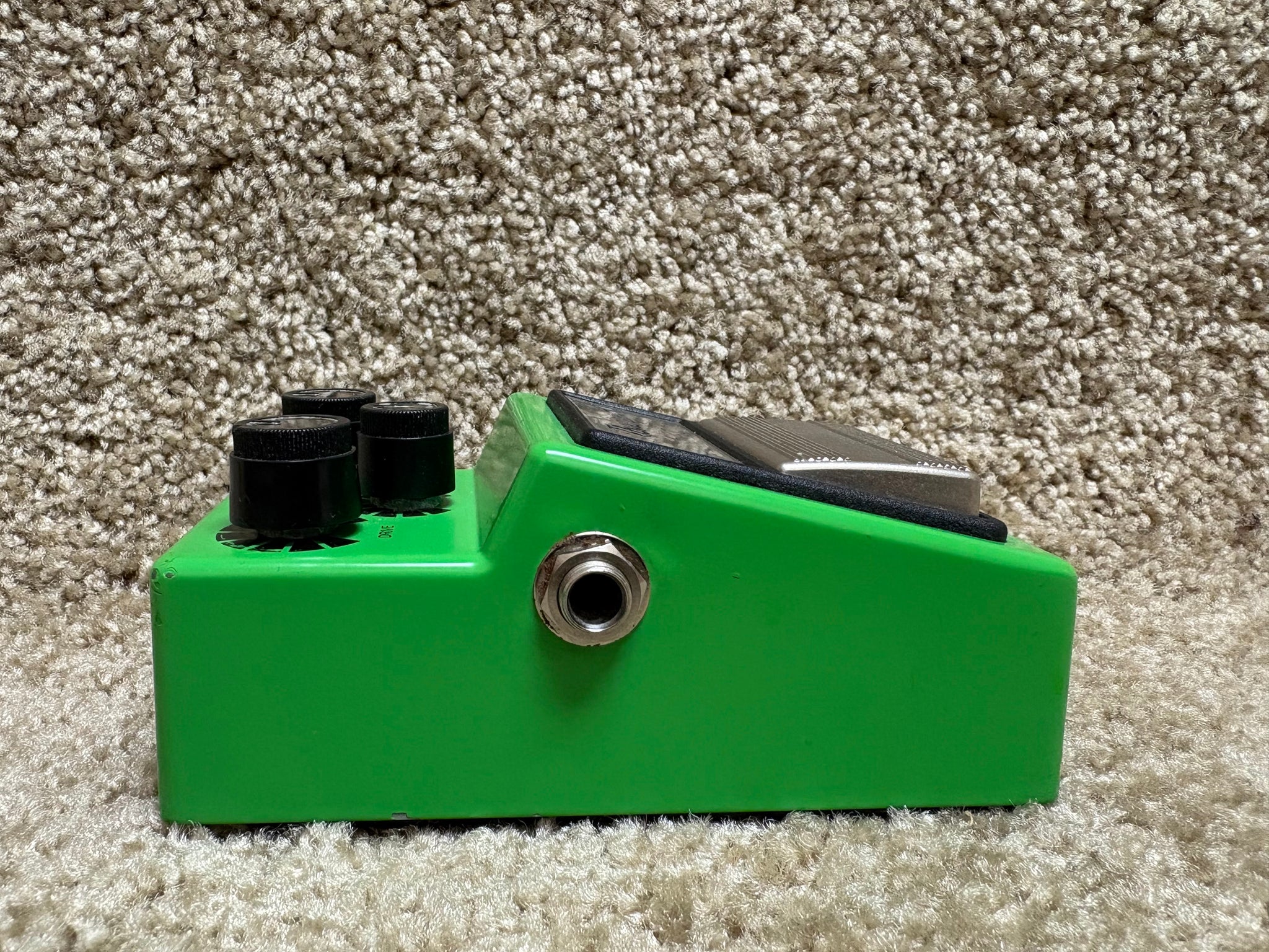 Controls: Overdrive, Tone and Level. Input is on the right side. Output is on the left side.