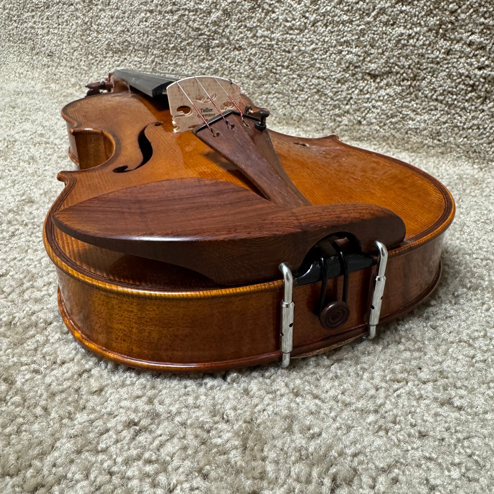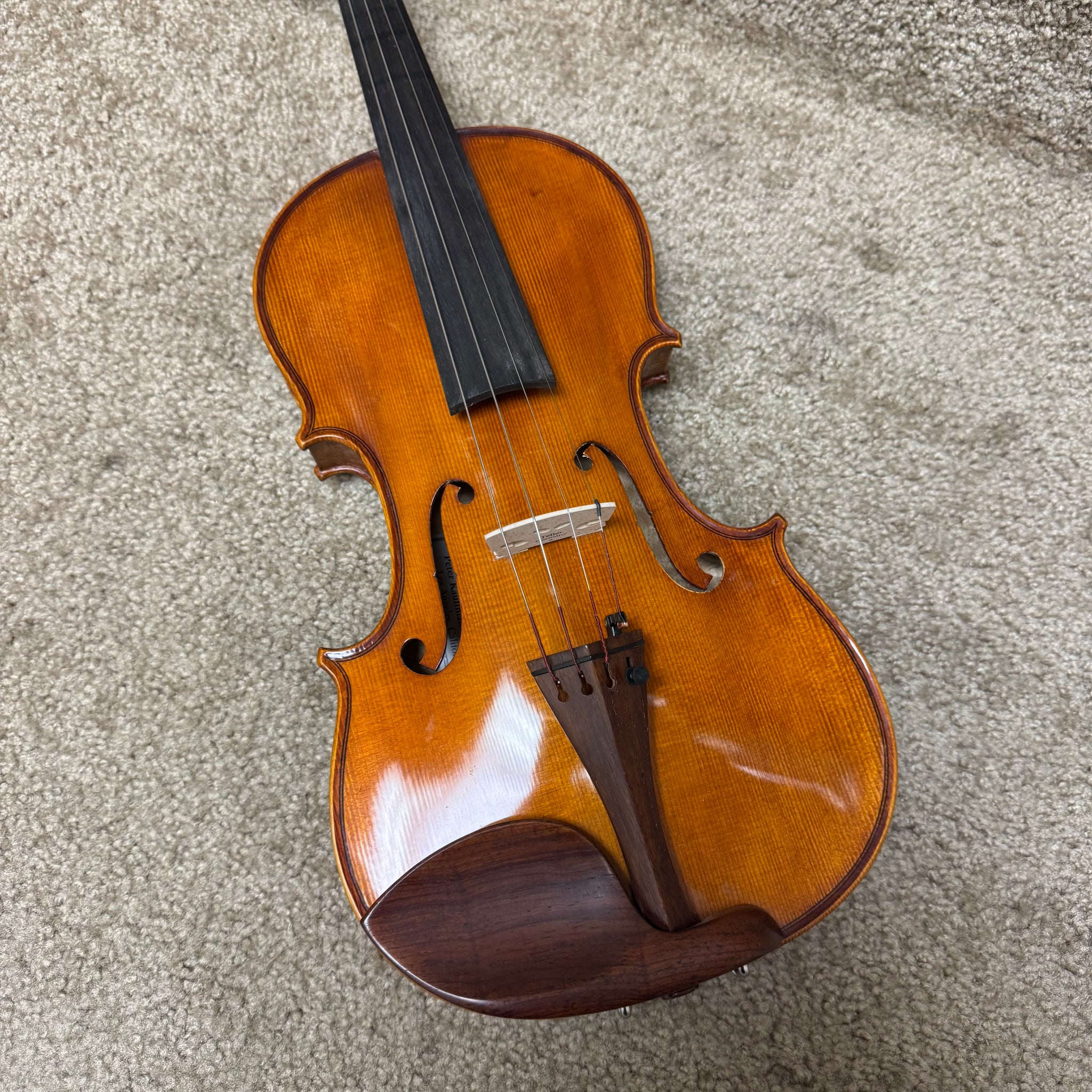 '“Peter Kauffman” violin. Transparent, warm sound with antique dark brown varnish. Easy to response, made of nicely flamed maple. The maker combines distinctive workmanship and quality material to produce truly fine violin for the dedicated student or serious amateur."
