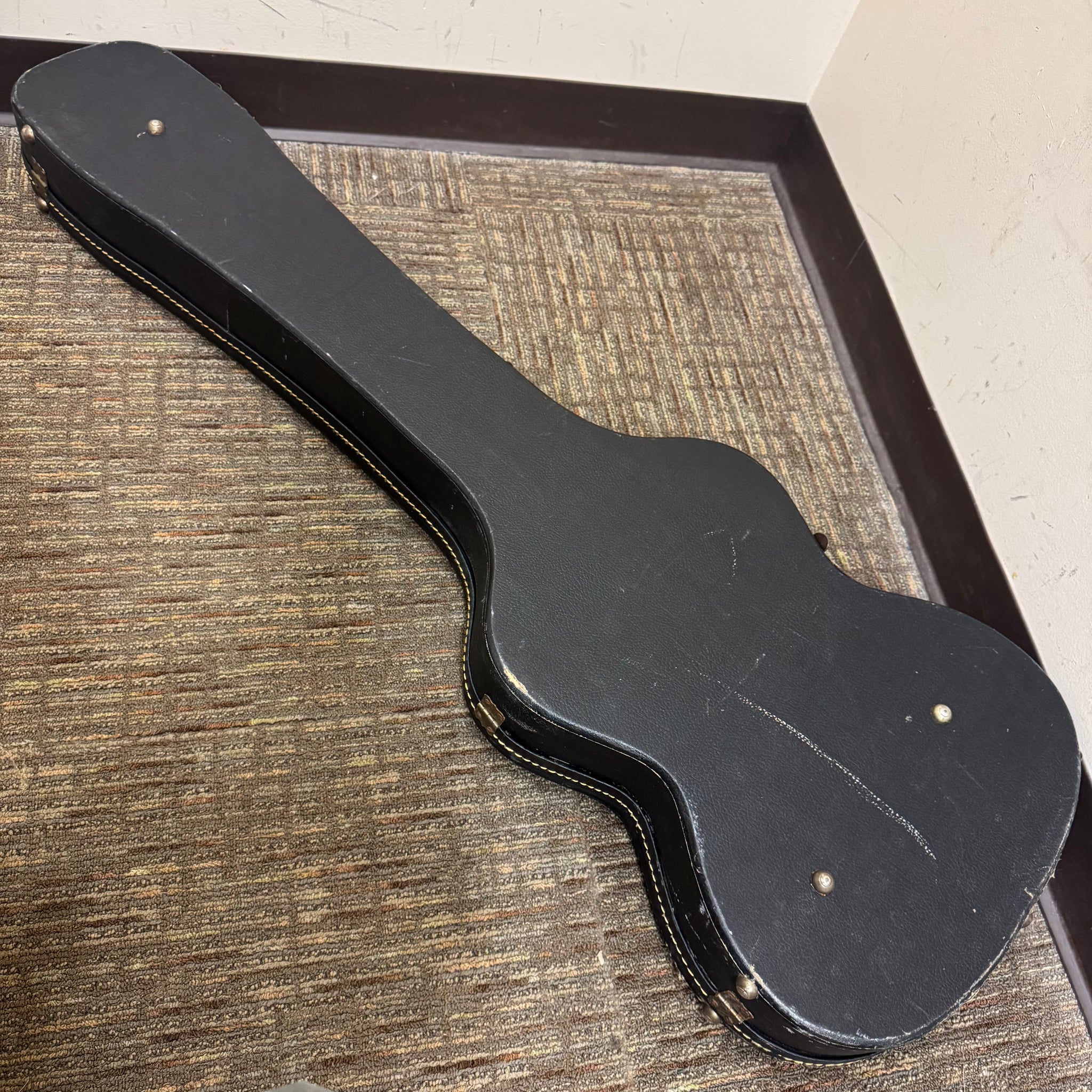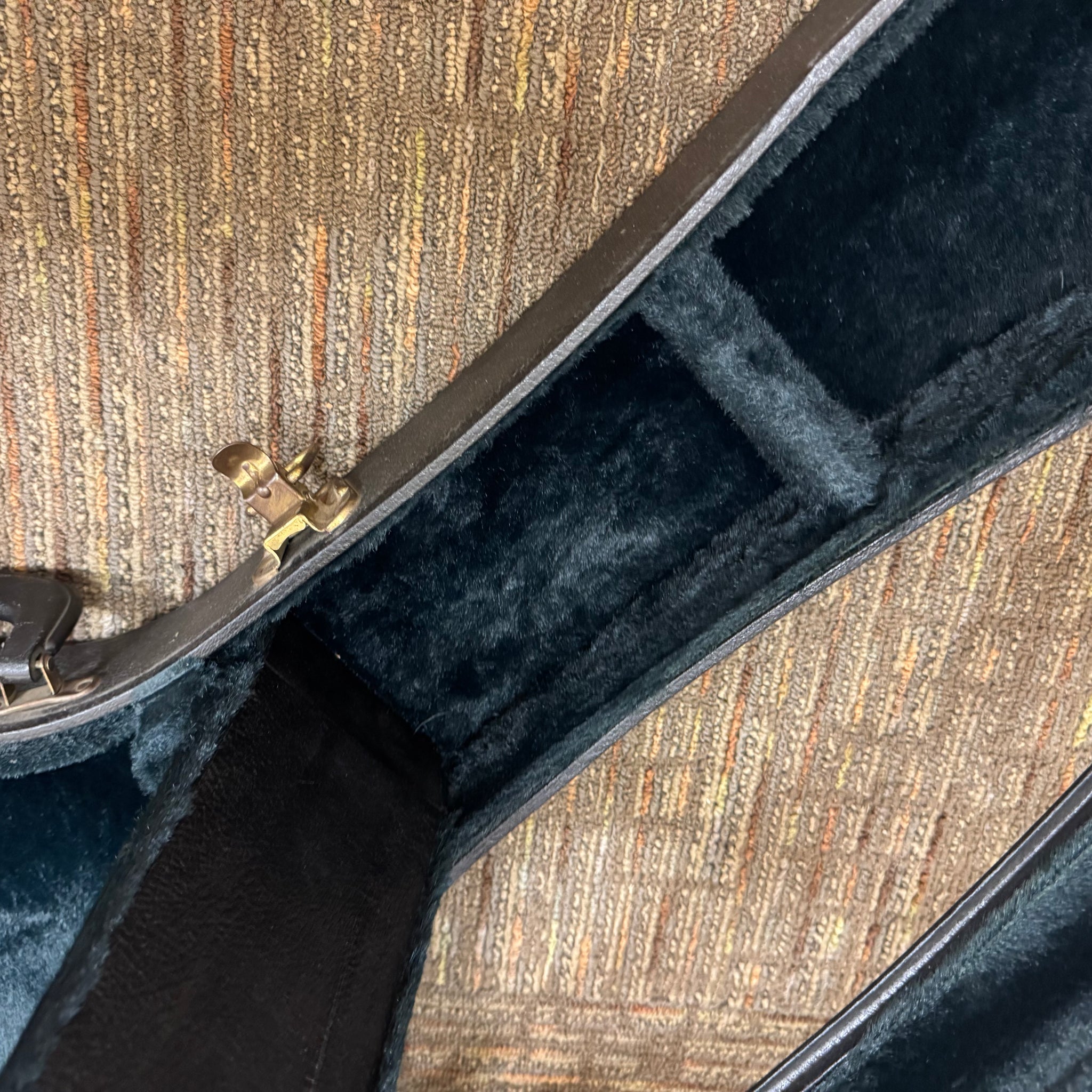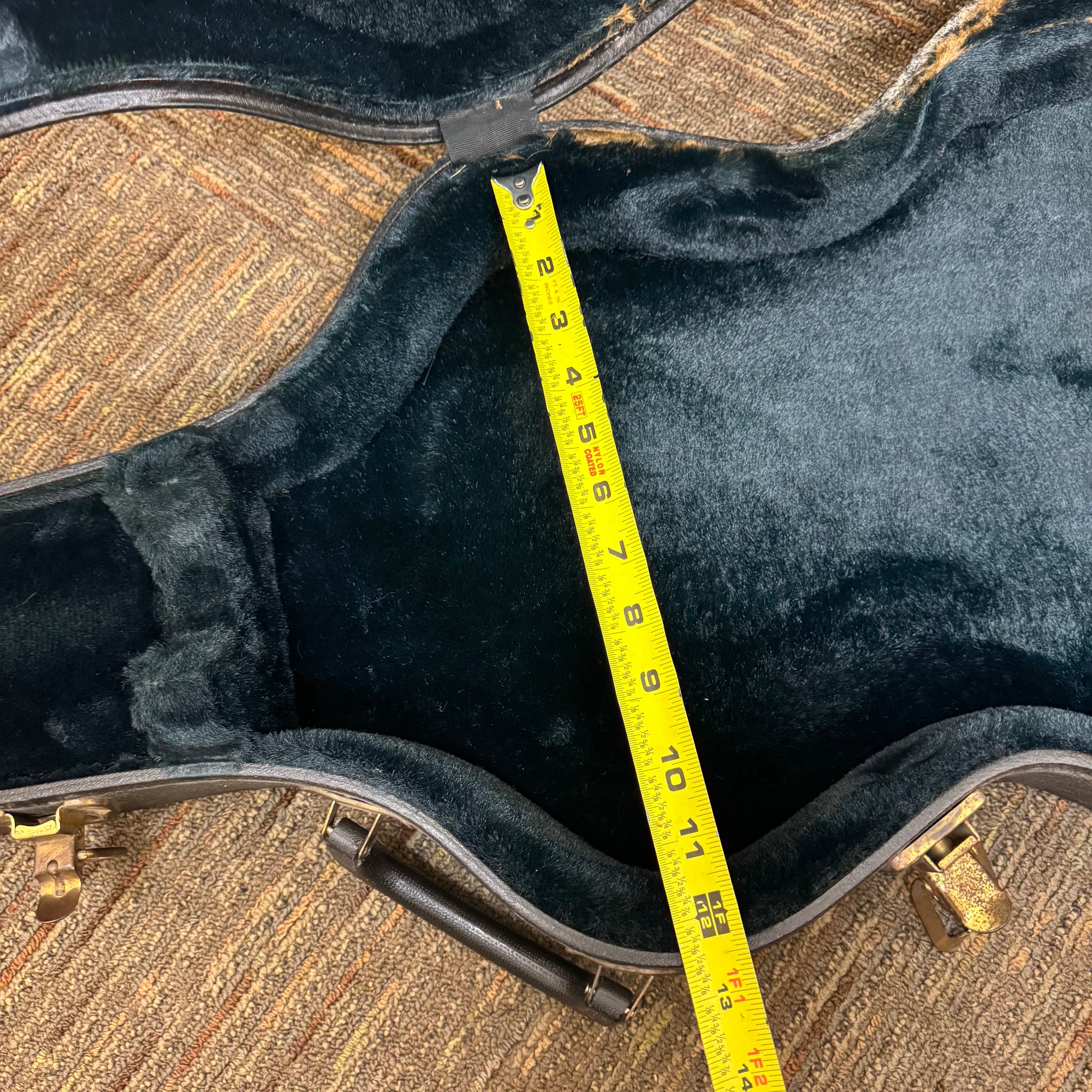 This is a hardshell bass case with some damage on the lower bout and scratches on the outside. This is possibly a Music Man case or a Gretsch case. Please view attached photos.