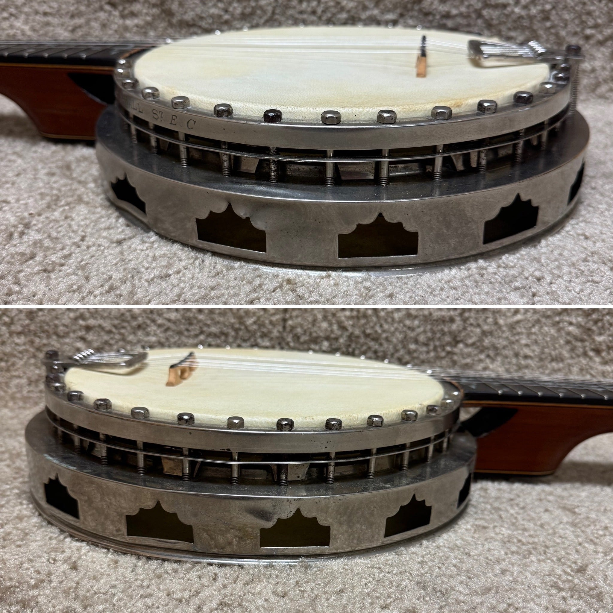 There are some light dents in the metal and the tuning machines have been replaced. We are included the original tuning machines.