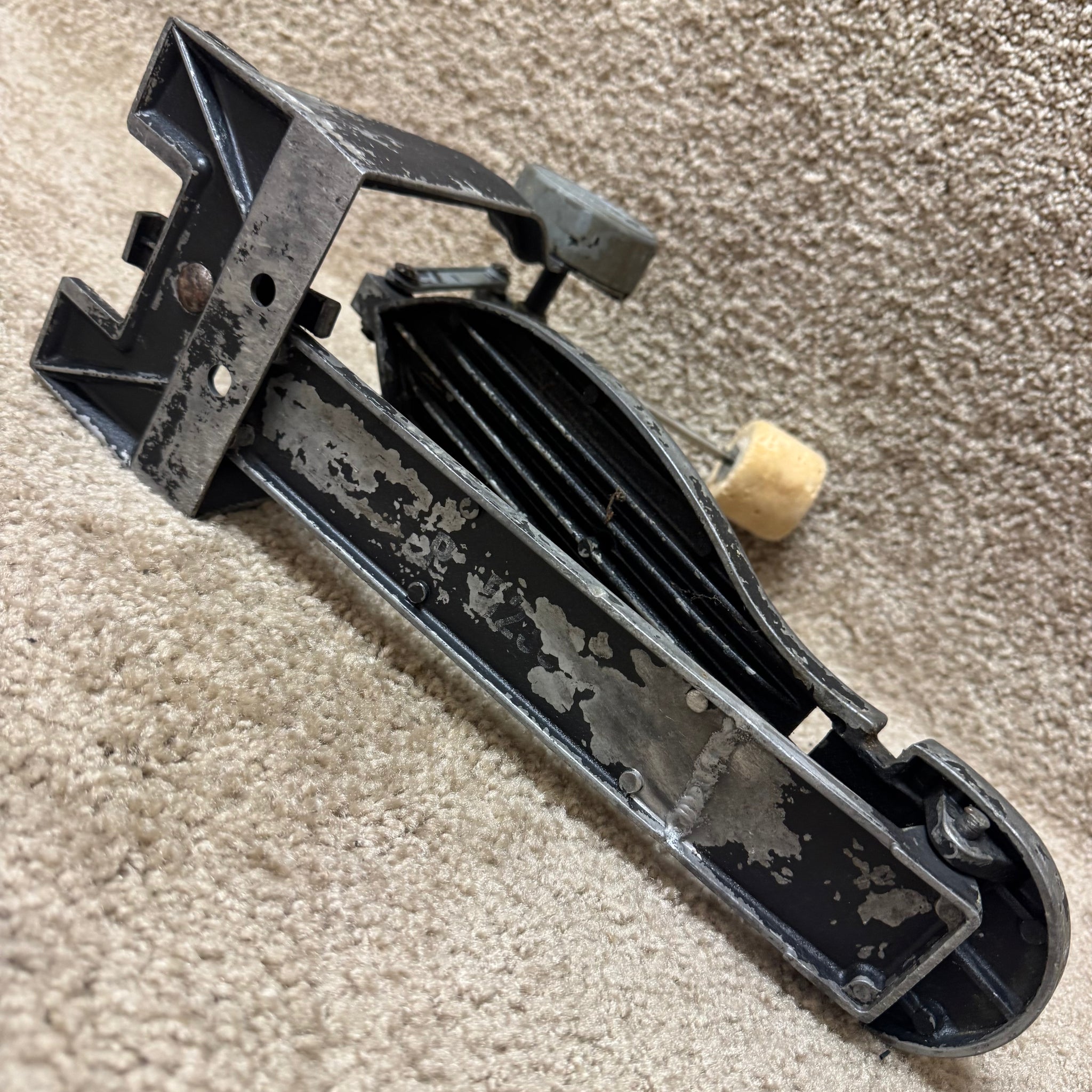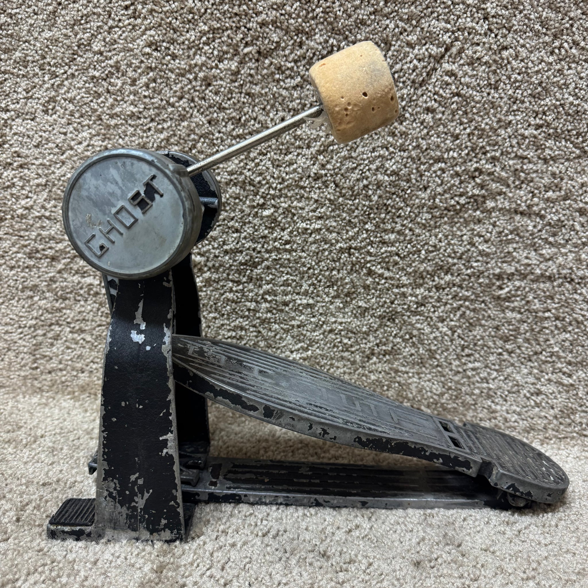 This vintage direct drive Ghost pedal shows some corrosion and residue around the entirety of the pedal. It was once black, but most of the black paint is coming off. Still works!