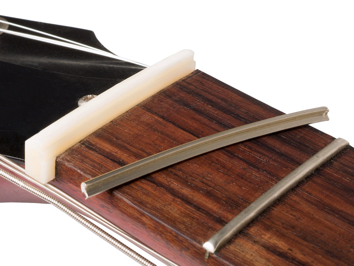 "The Zero Glide Replacement Nut System borrows the "zero fret" concept to reduce string contact in the nut by up to 93%, increasing tuning stability, playability, and open string tone." For Gibson Style Guitar (blank).