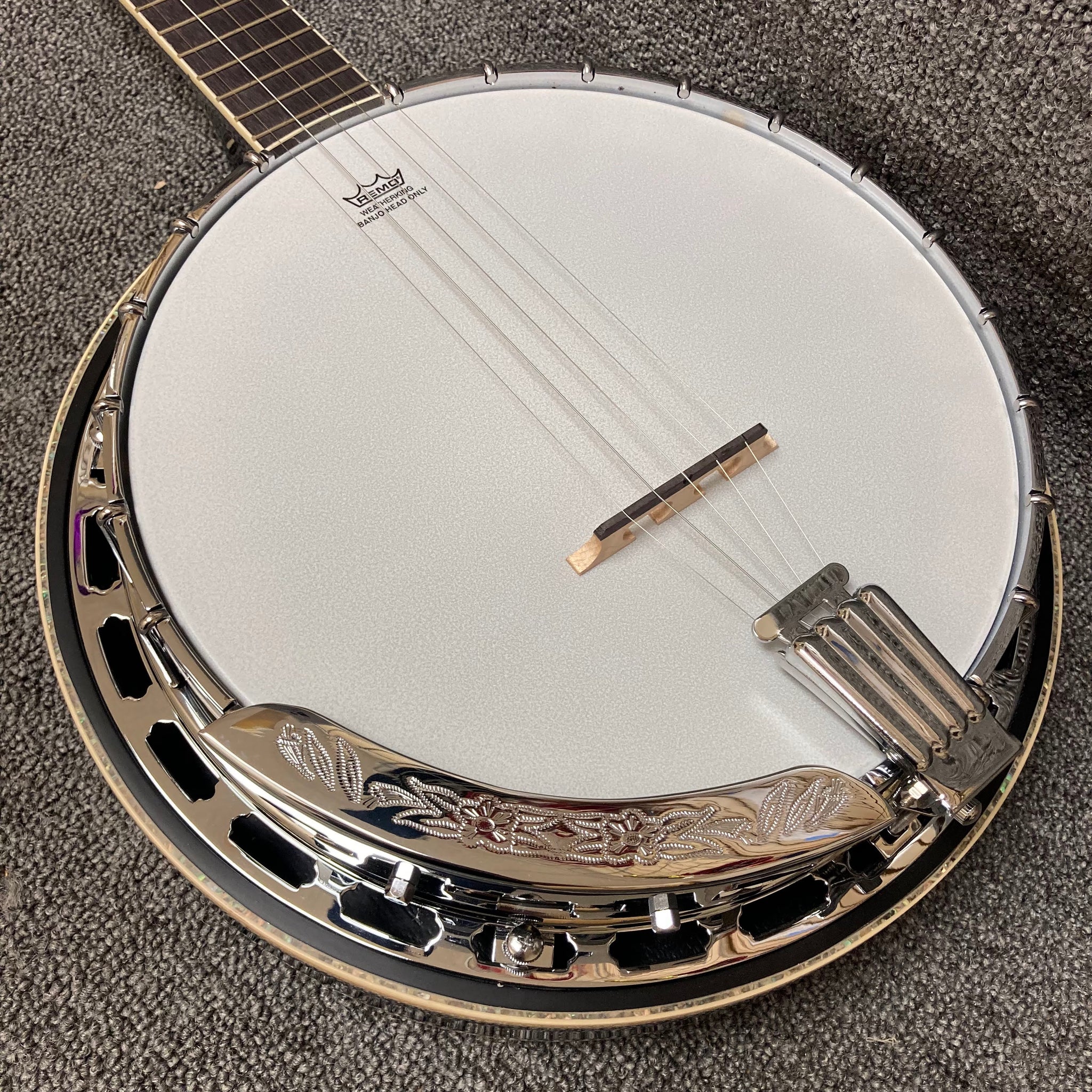 This Ibanez B300 is a delightful resonator banjo for new players and experienced players alike! It is a modestly-priced full-featured banjo that comes with an okoume neck, a purpleheart fretboard with a vine inlay, a poplar block rim and a beautifully engraved armrest. The natural finished B300 has a stunning walnut resonator that is double bound with abalone purfling. This Banjo is also equipped with planetary tuners and 24 brackets. This is an amazing value you won't want to let slip through your fingers.