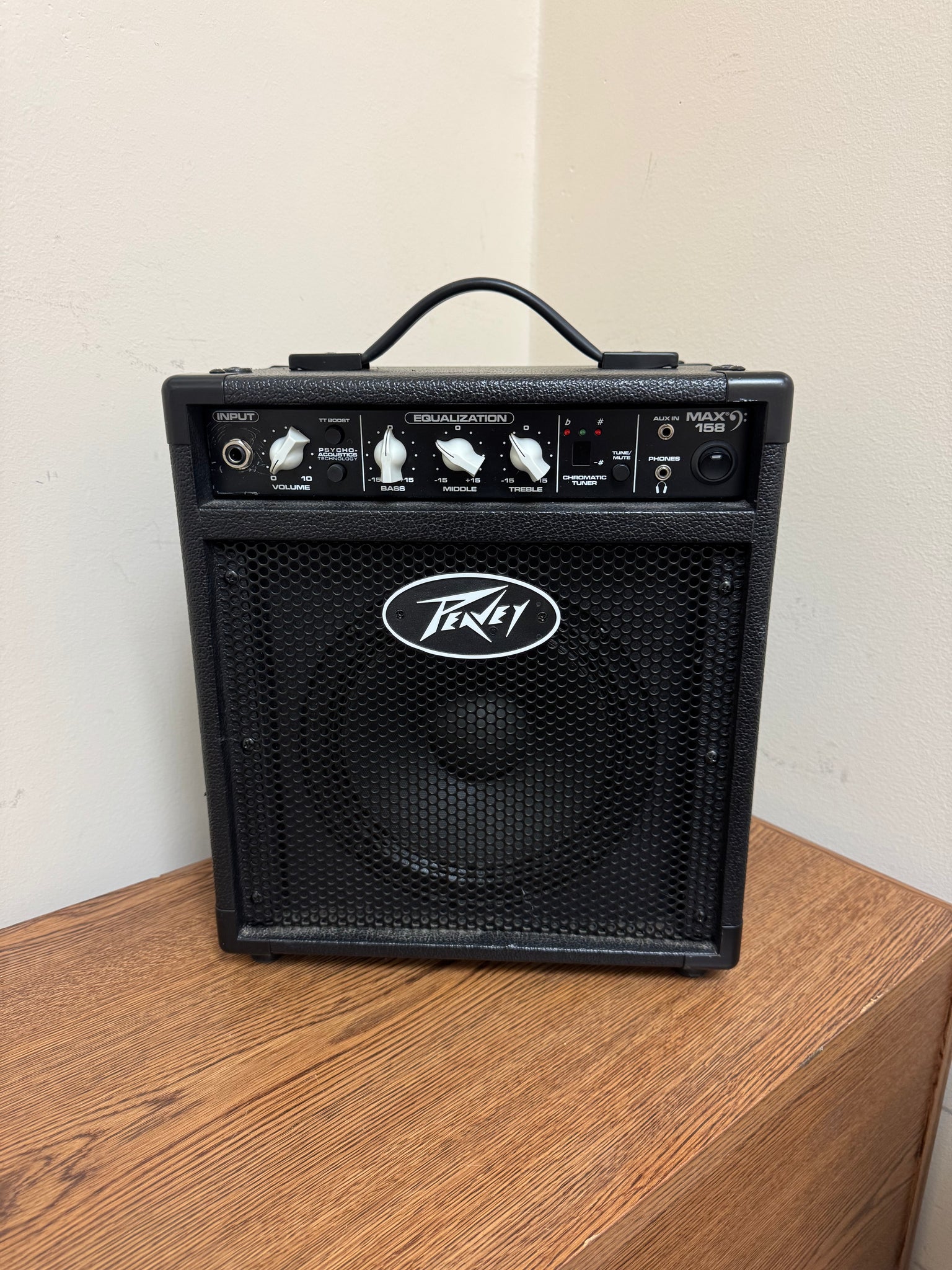 The Max 158 bass combo amp is a 20 watt 1x8" bass practice amp loaded with features, including 1/4" input and Volume with TransTube distortion boost and psycho-acoustic low end enhancement, a 3-band EQ, chromatic tuner and 1/8" jacks for phones output and auxiliary input. The Max 158 also includes Peavey-exclusive DDT speaker protection.