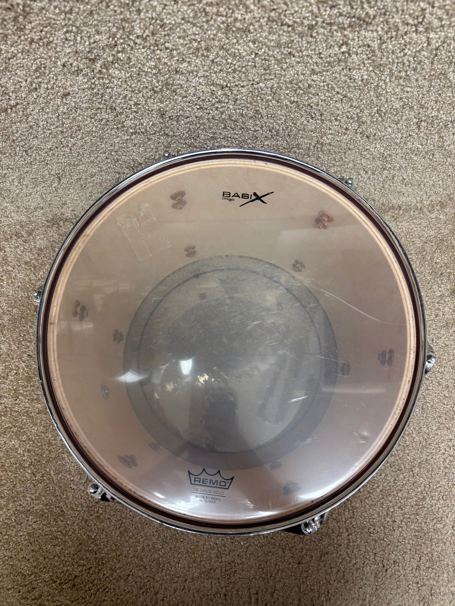 This 13x11 Basix rack tom shows minor corrosion on both the interior screws and exterior hardware but does no appear to show any significant damage to the exterior shell such as scratches or dents. The tom suspension mount holds securley in place allowing the tom to breath freely while being played.