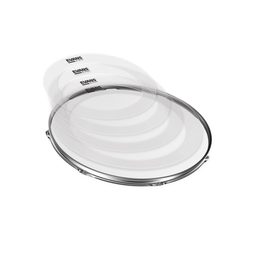 The EVANS E-Ring is an easy-to-use external overtone control ring for drumheads that floats on the surface of a drumhead to remove overtones and flattens the drumhead's sound, allowing for easier tuning.