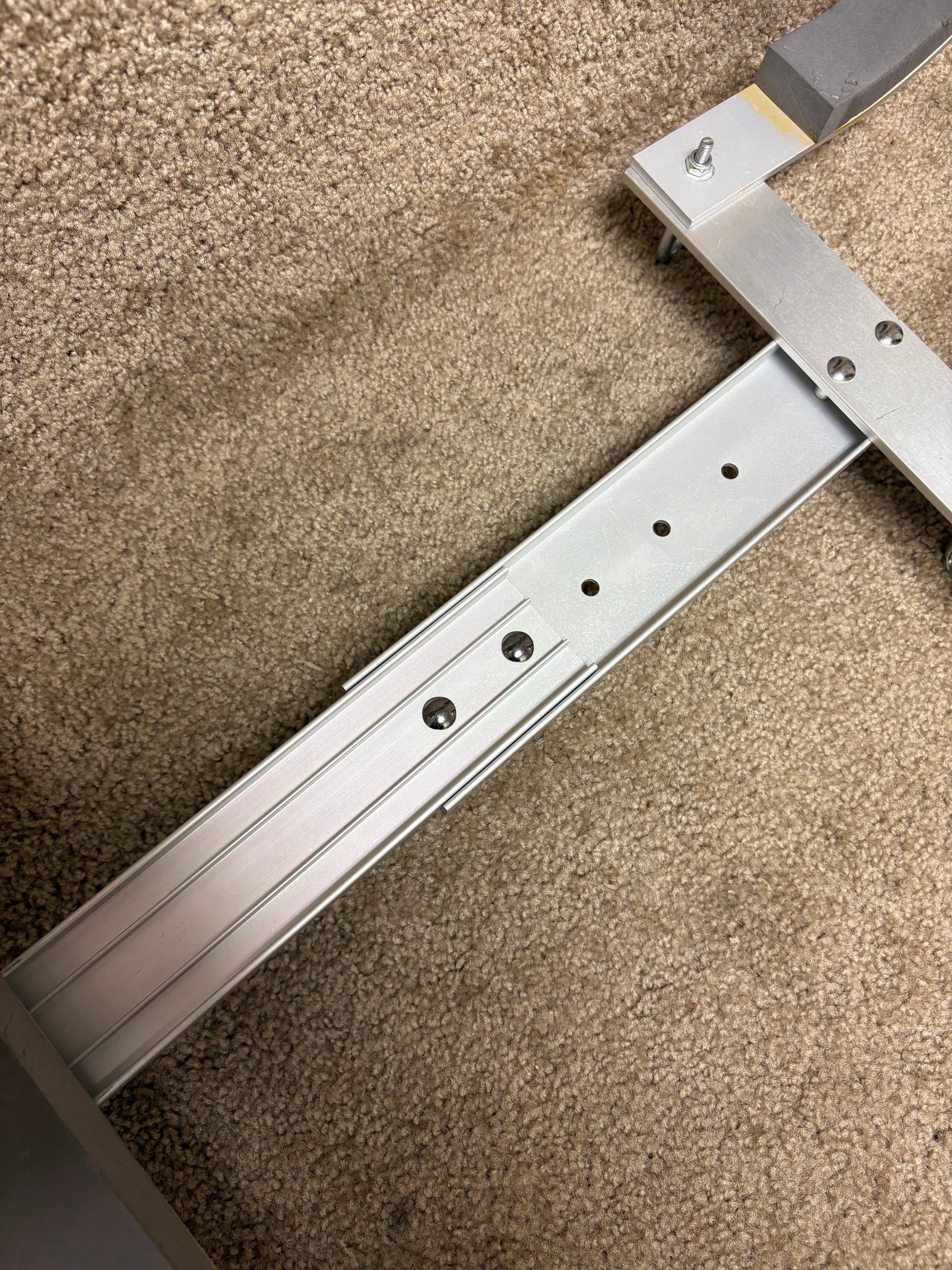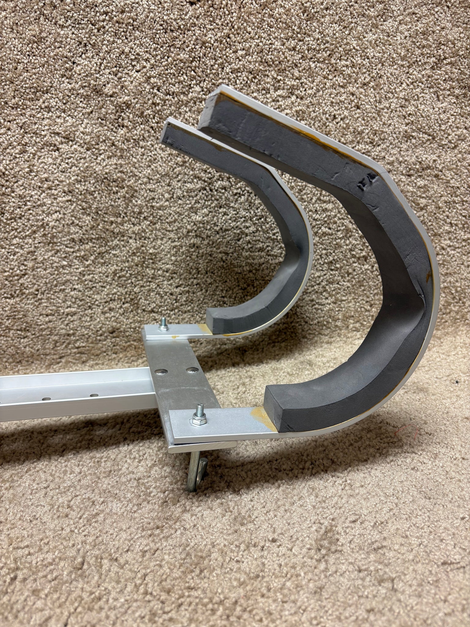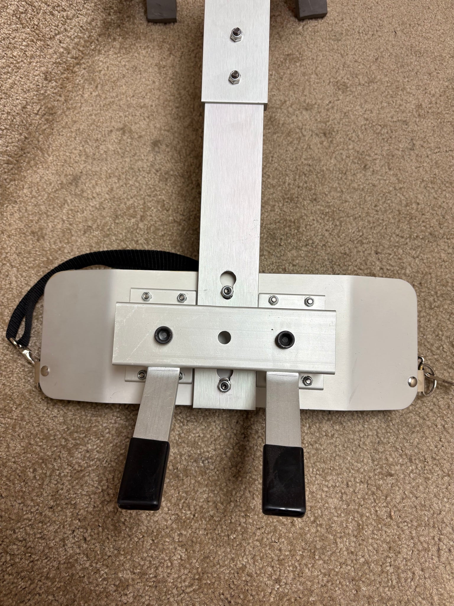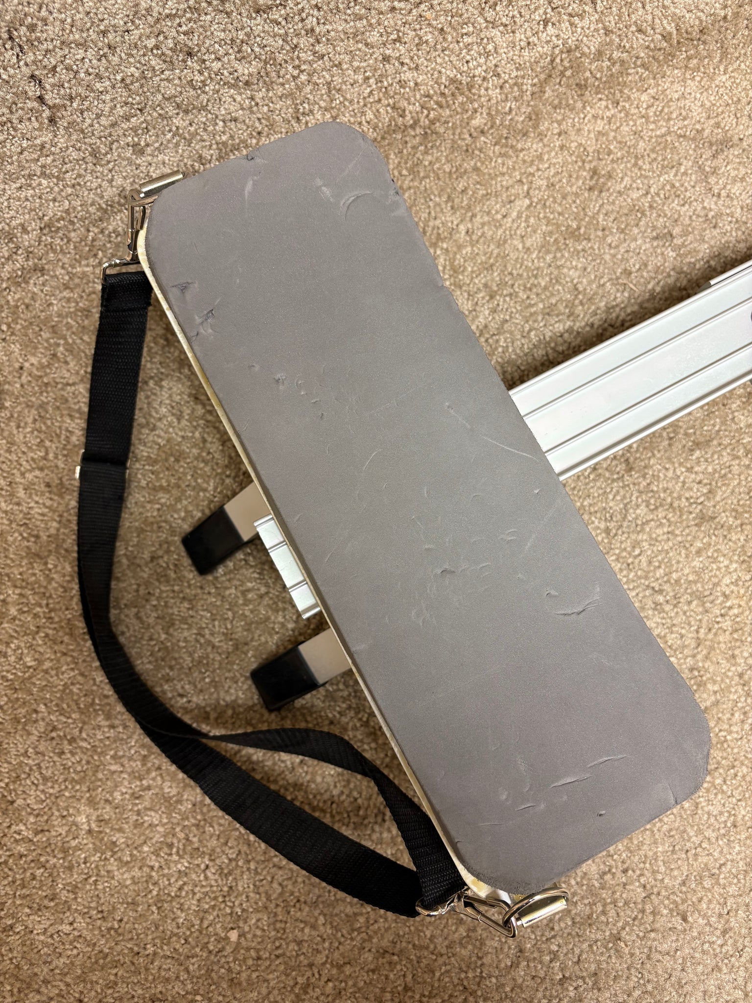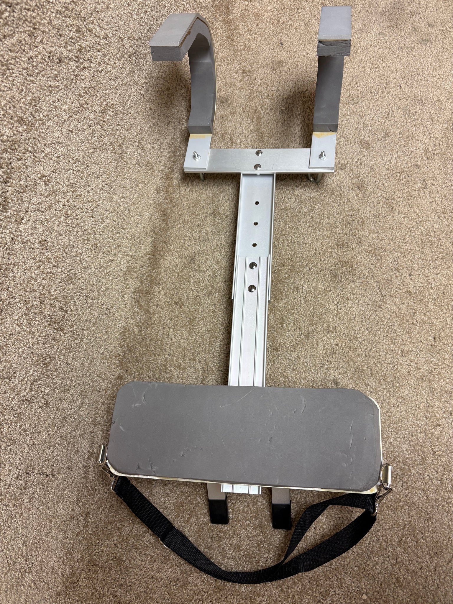 This marching bass drum carrier shows a few minor scratches in the padding but is otherwise clean cosmetically. All hardware appears to be in working condition and can easily be adjusted by tightening or loosening the attached screws on the carrier. The carrier shoulder braces, center rod and abdomen plate are easily height adjustable to fit any size.