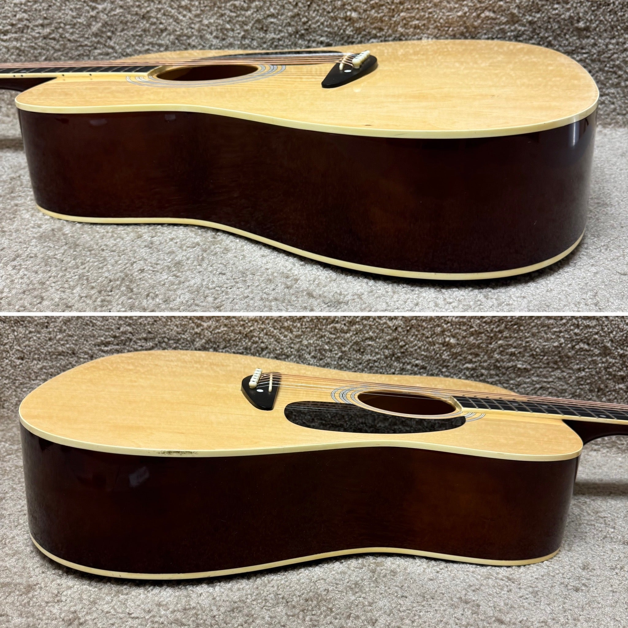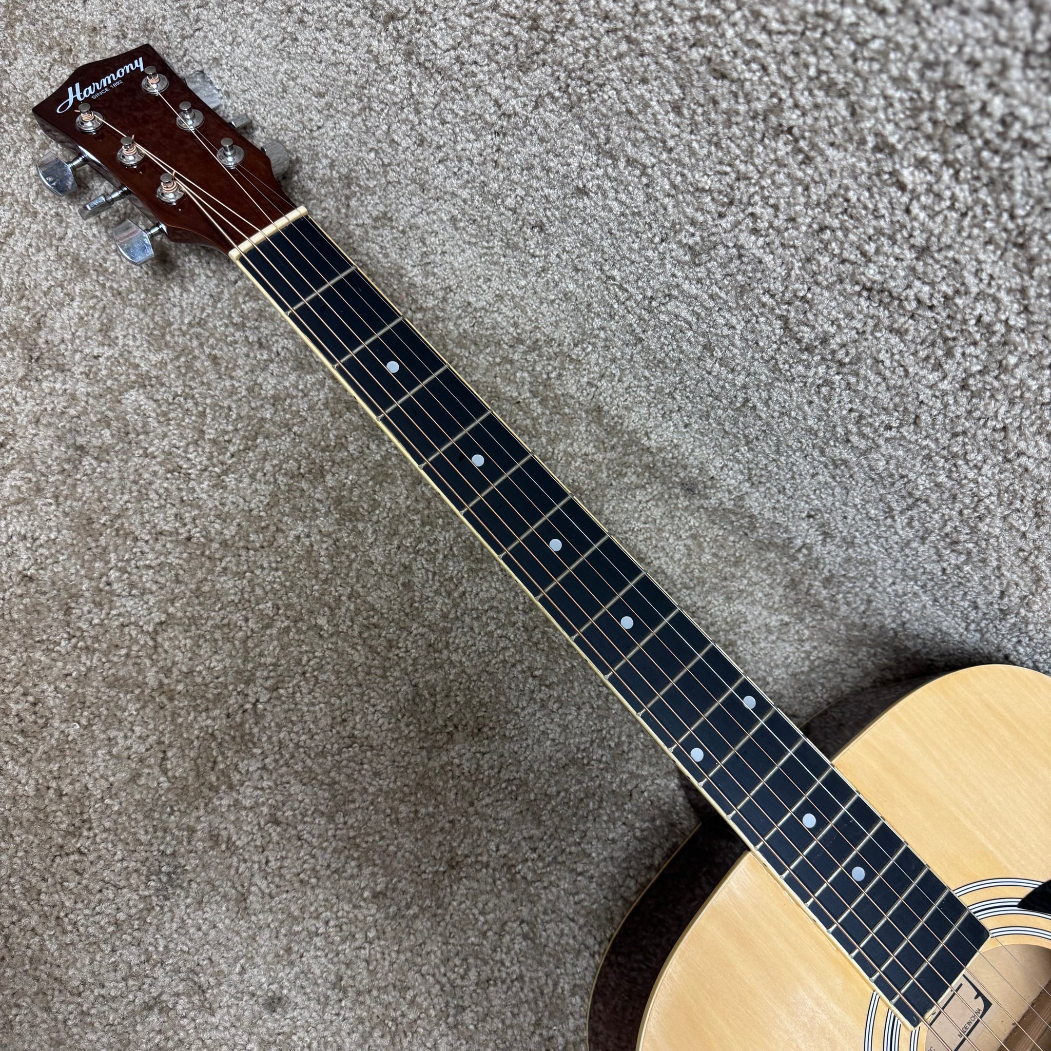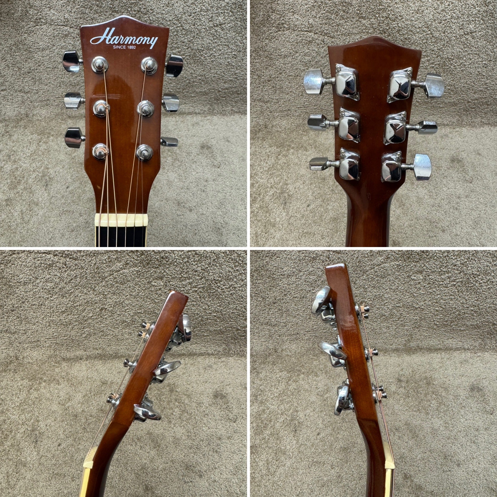 Harmony is a name synonymous with affordable quality music gear and has been for many decades! This dreadnought guitar is no exception and this particular one is in very good shape with just a few noticable dings and scratches on the top, sides and back. This would be a great choice for a student, beginner or an experienced player just looking for a backup instrument.