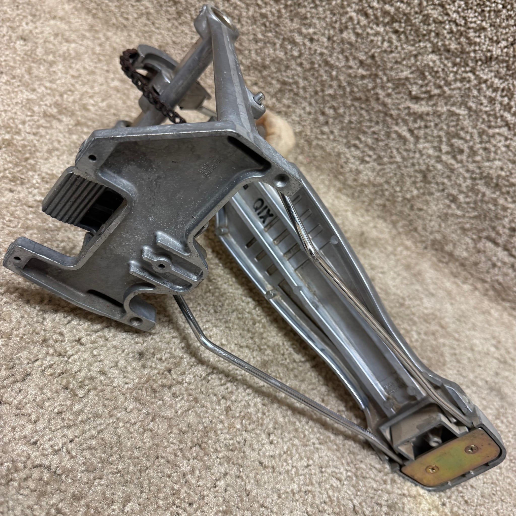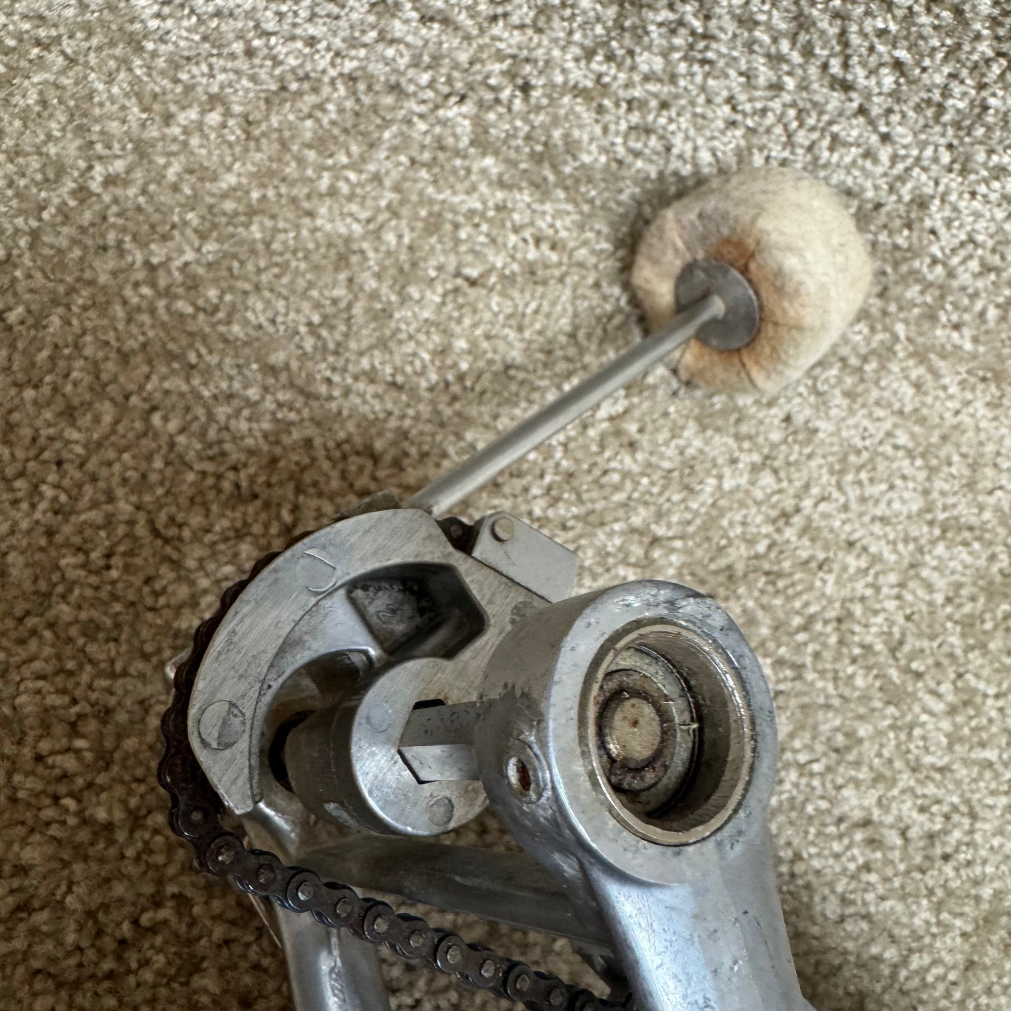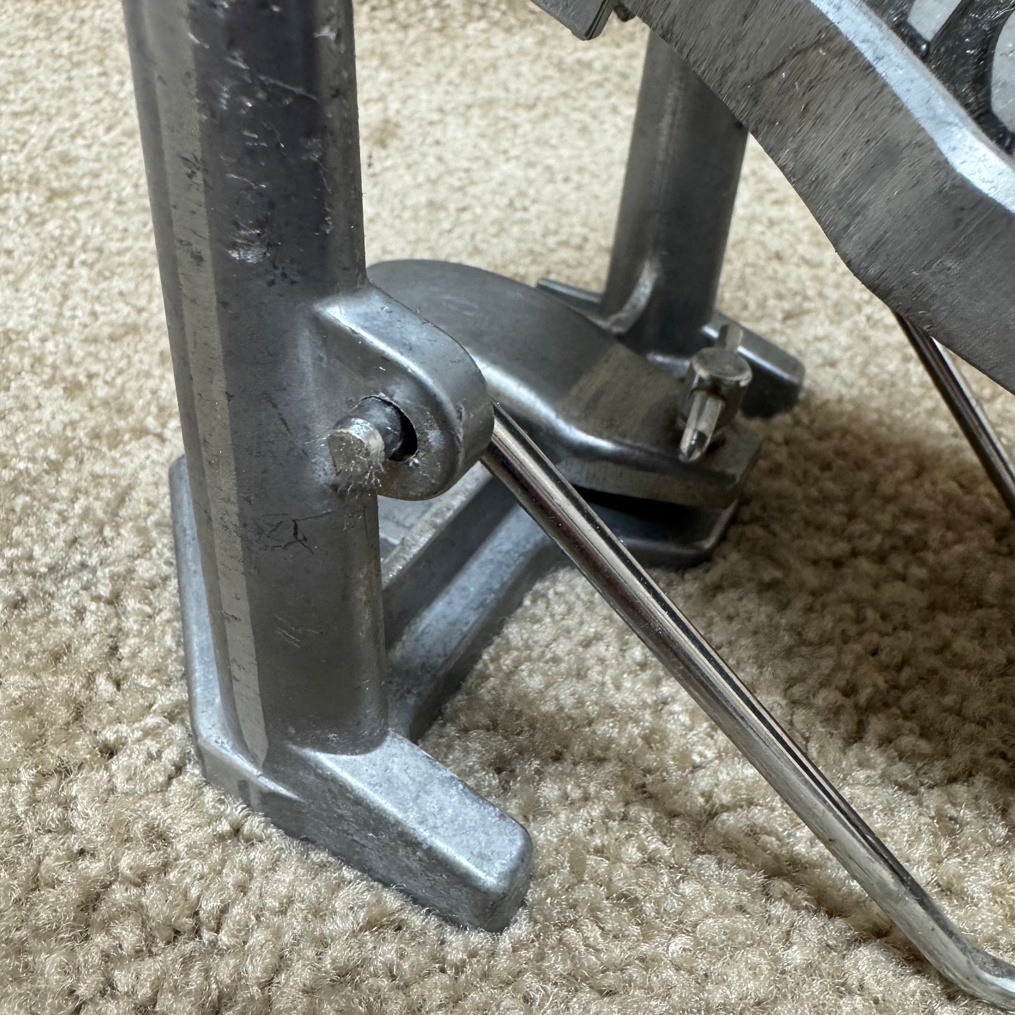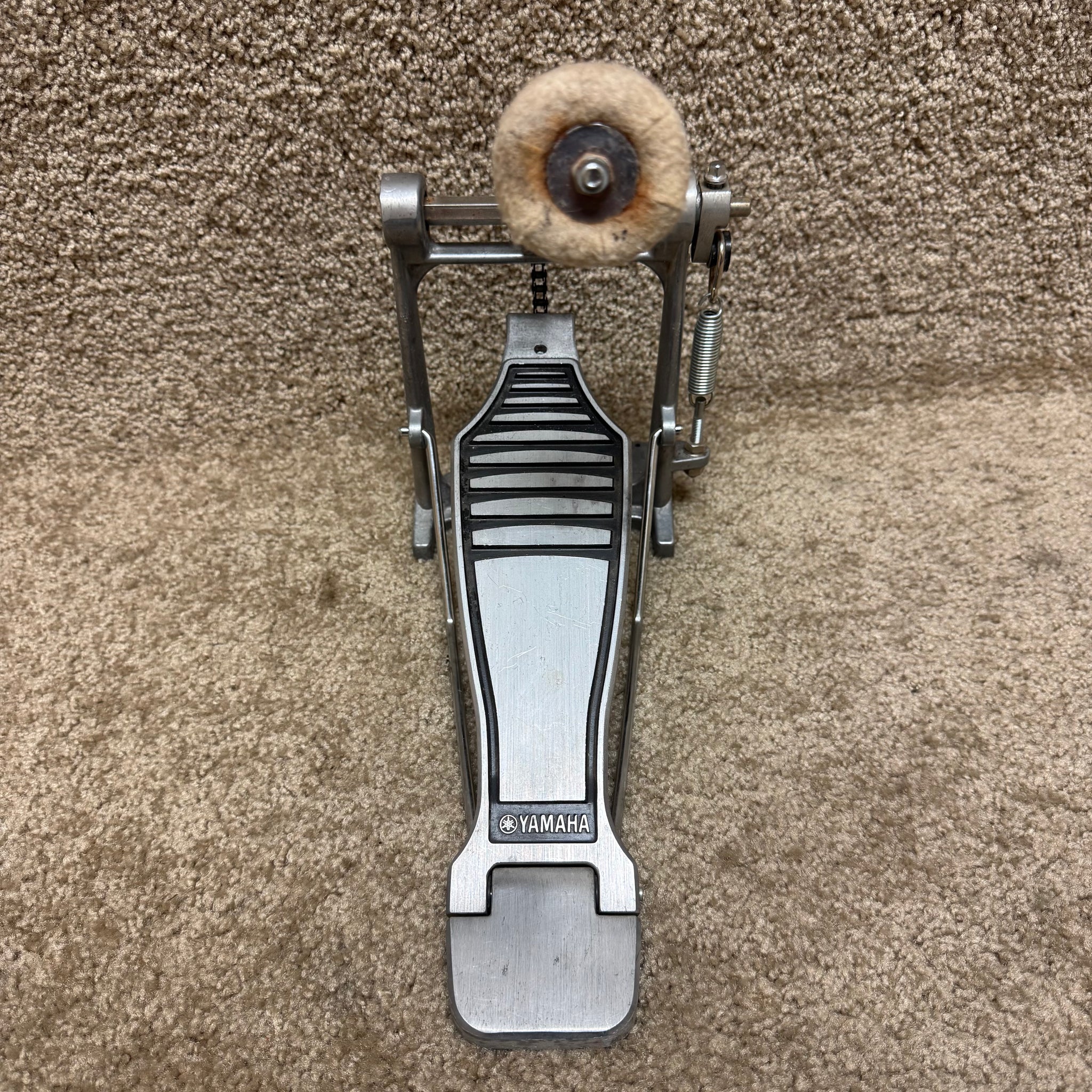 This is a Yamaha single chain single kick drum pedal. It has several signs of age and use. Particularly the chain has some corrosion. Please view the photos included. This pedal does not have a base plate for slip resistant ease, but does tighten to your bass drum hoop for provided support. This would make for a great beginner pedal.