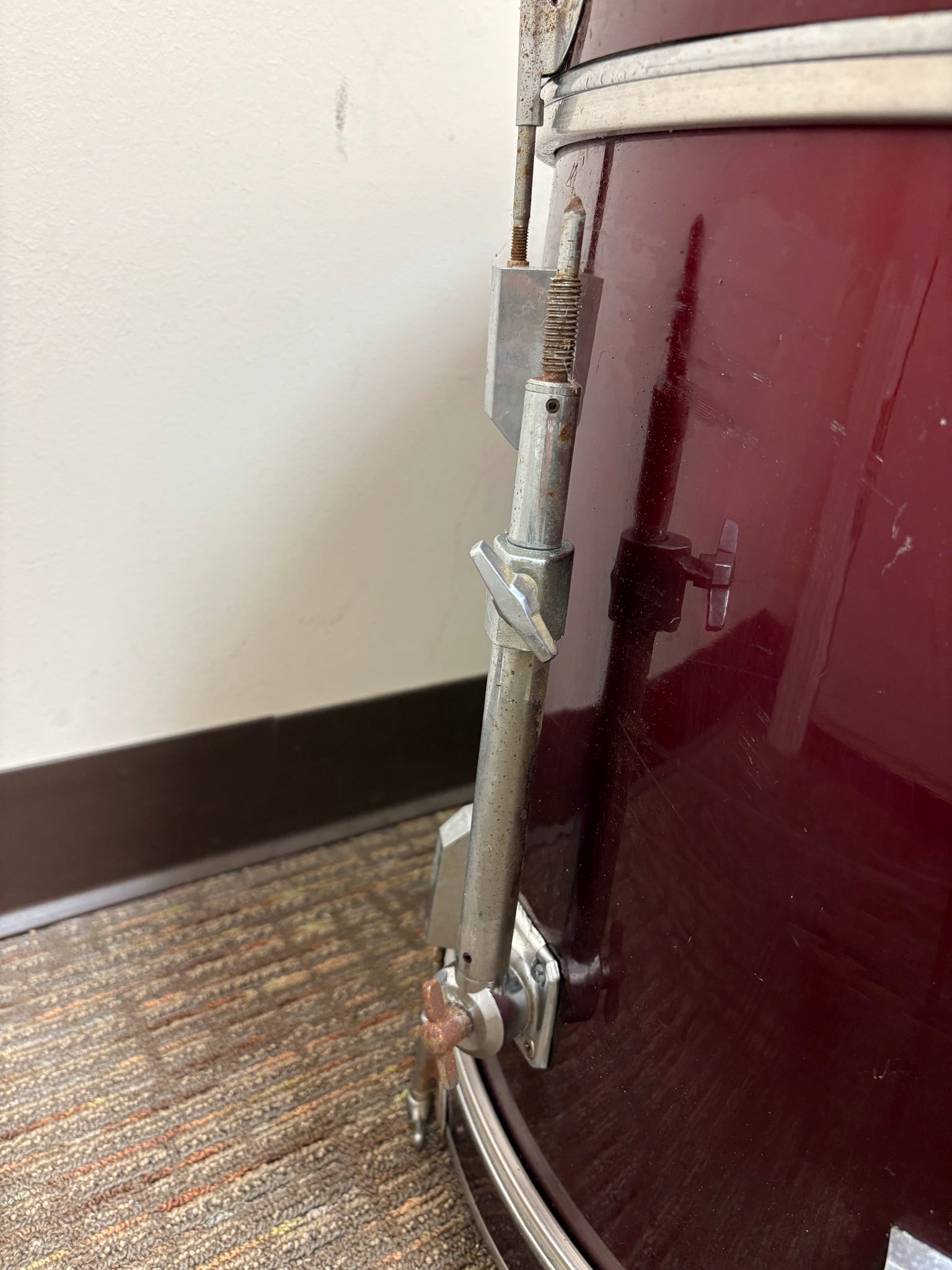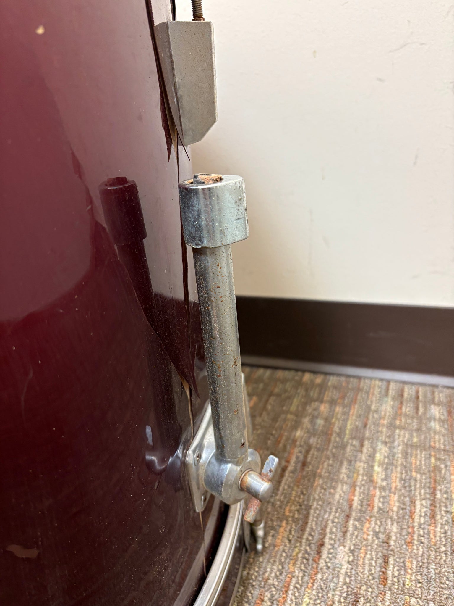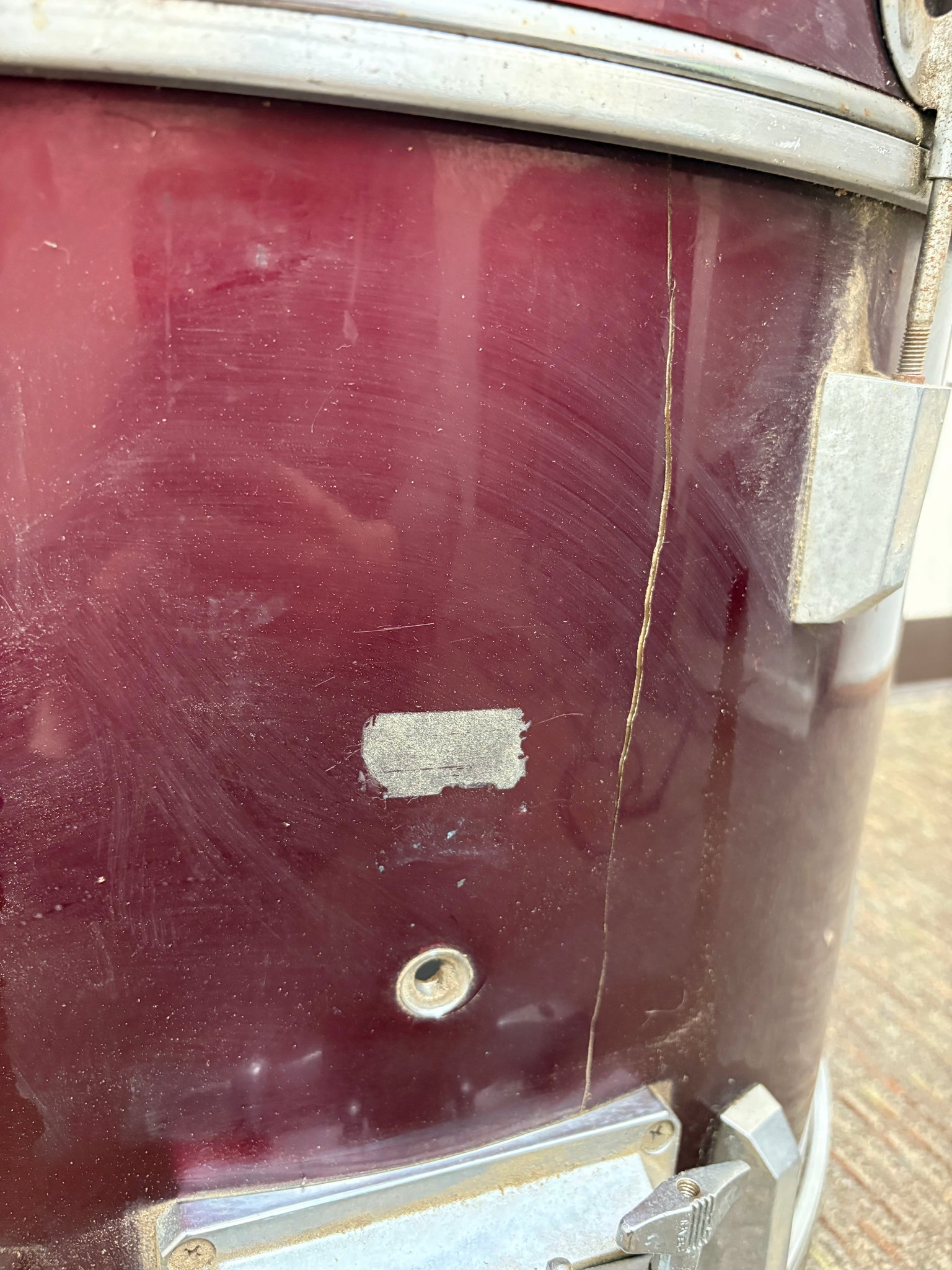 This kick drum is missing one lower half of a spur and also shows significant cracks in the wrap with multiple scratches around the entirety of the body. The hardware shows heavy corrosion, specifically on the tension rods and hoops.