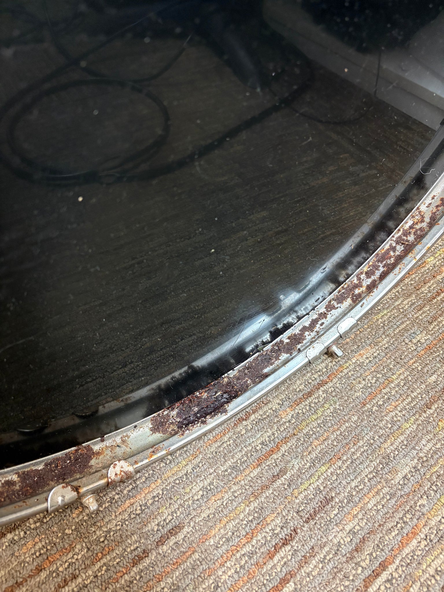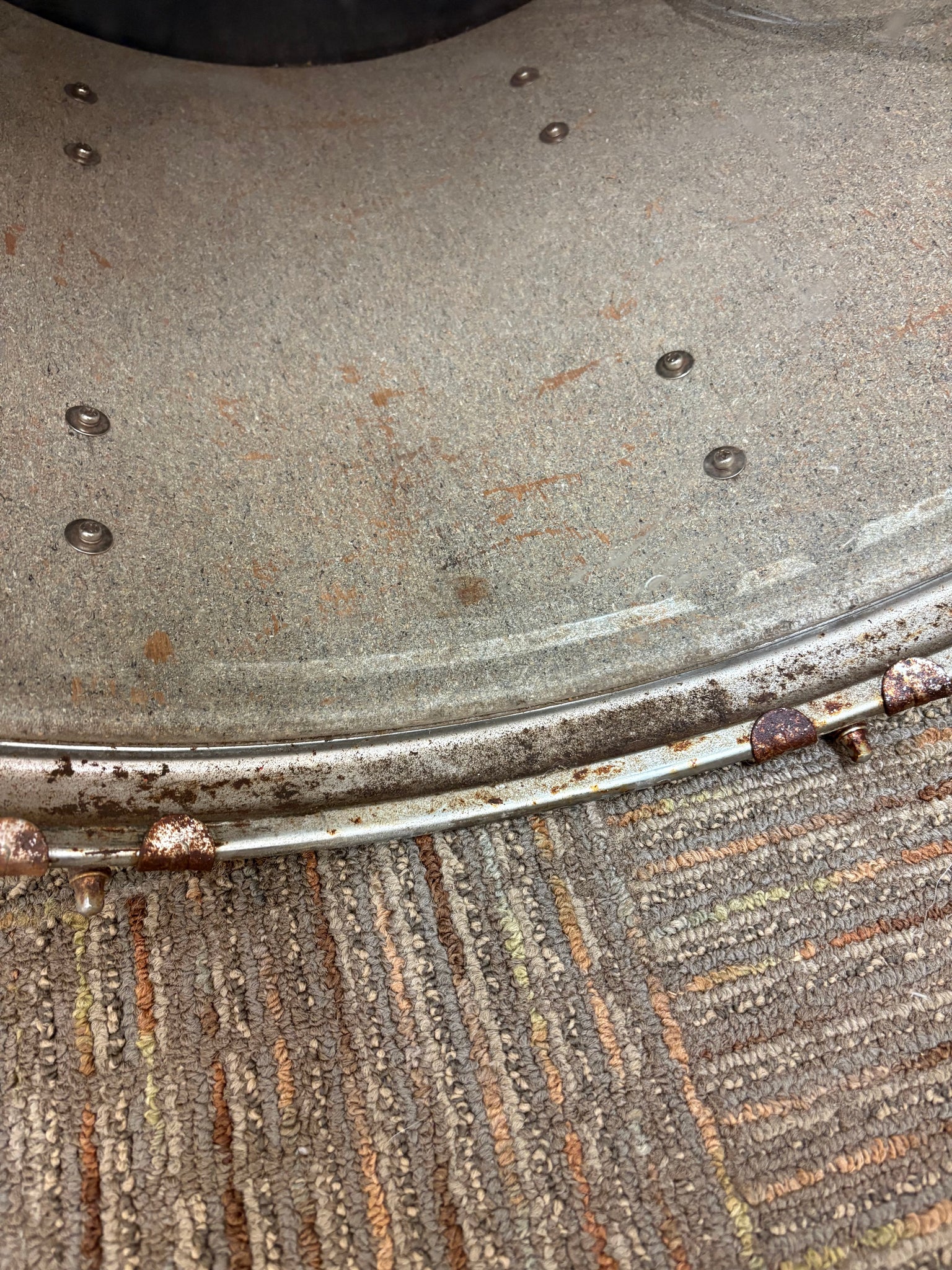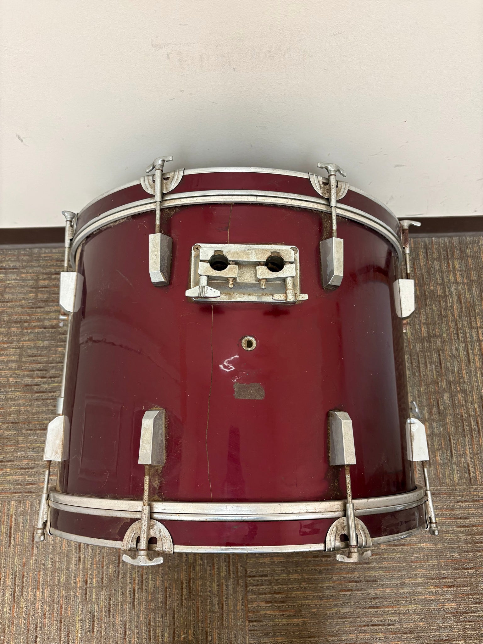 This kick drum is missing one lower half of a spur and also shows significant cracks in the wrap with multiple scratches around the entirety of the body. The hardware shows heavy corrosion, specifically on the tension rods and hoops.